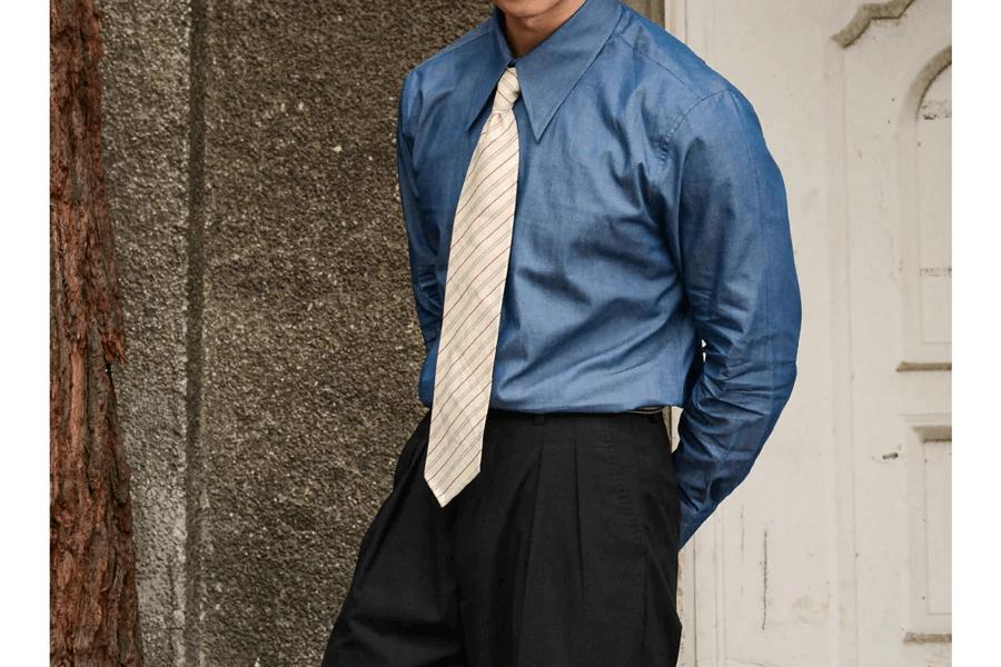 Unleash your inner dapper gentleman with our men's pointed collar denim shirt. Crafted from 100% premium cotton in a rich blue hue. Long sleeves and a tailored fit create a sophisticated, polished silhouette. Button down this iconic style for a touch of retro flair....- $85.00