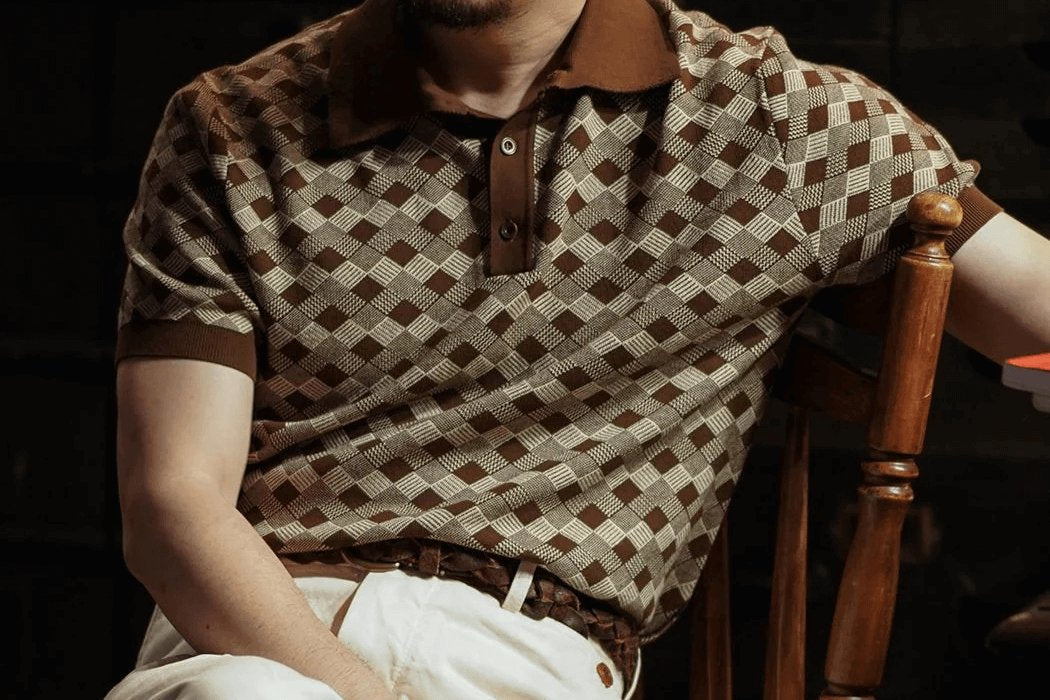 Discover our Men's Argyle Knitted Polo Shirt, a premium cotton blend in coffee beige. With a 3-button collar, it offers a business-elegant style. The intricate argyle pattern, thread cuff, and hem enhance its sophistication. Elevate your wardrobe and make a lasting impression.- $69.00