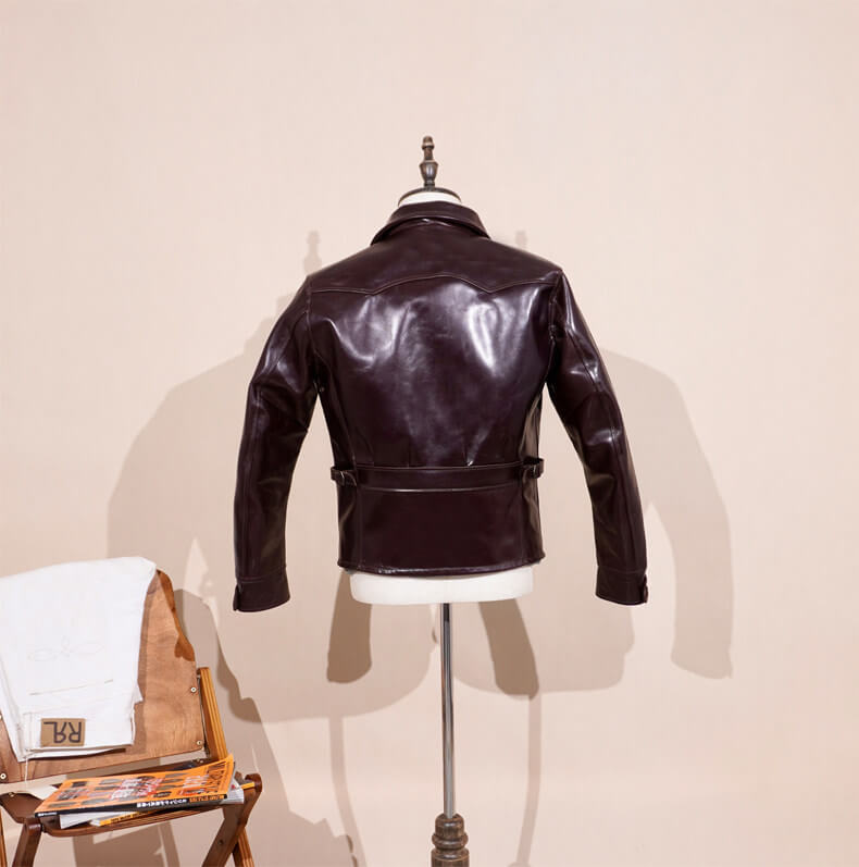 Classic 1930s Moto Style in slim fit. Select from our premium leathers: Japanese Black Tea core horsehide (1.4–1.5mm), rich Japanese Burgundy waxed horsehide (1.4–1.5mm), or American Black cowhide (1.3mm). 1.5mm Vegetable tanned American horsehide (Quilted Lining).