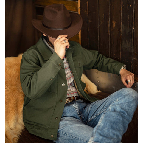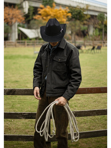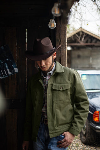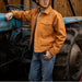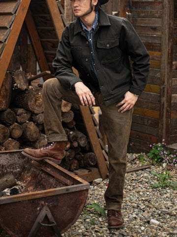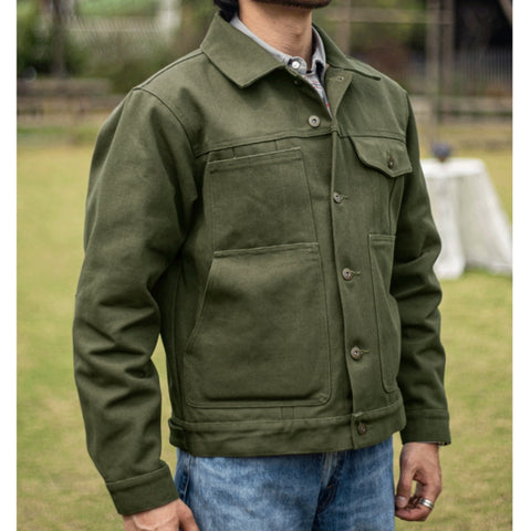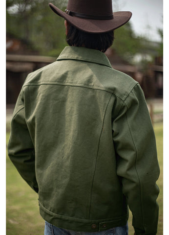 Embrace rugged American workwear with our men's cruiser jacket. Crafted from sturdy 21oz canvas that's been washed for a perfectly broken-in feel - no stiff fabric here. Choose from classic black, vibrant orange, or rich green hues. Multiple pockets provide ample storage for essentials. Antique metal accents and a sturdy zipper closure add vintage flair.