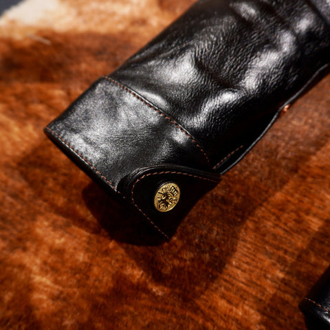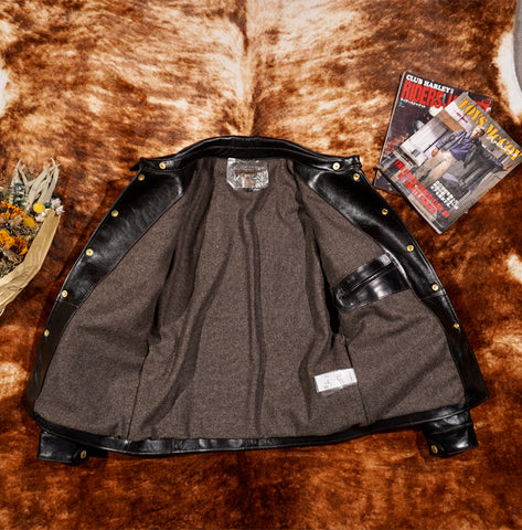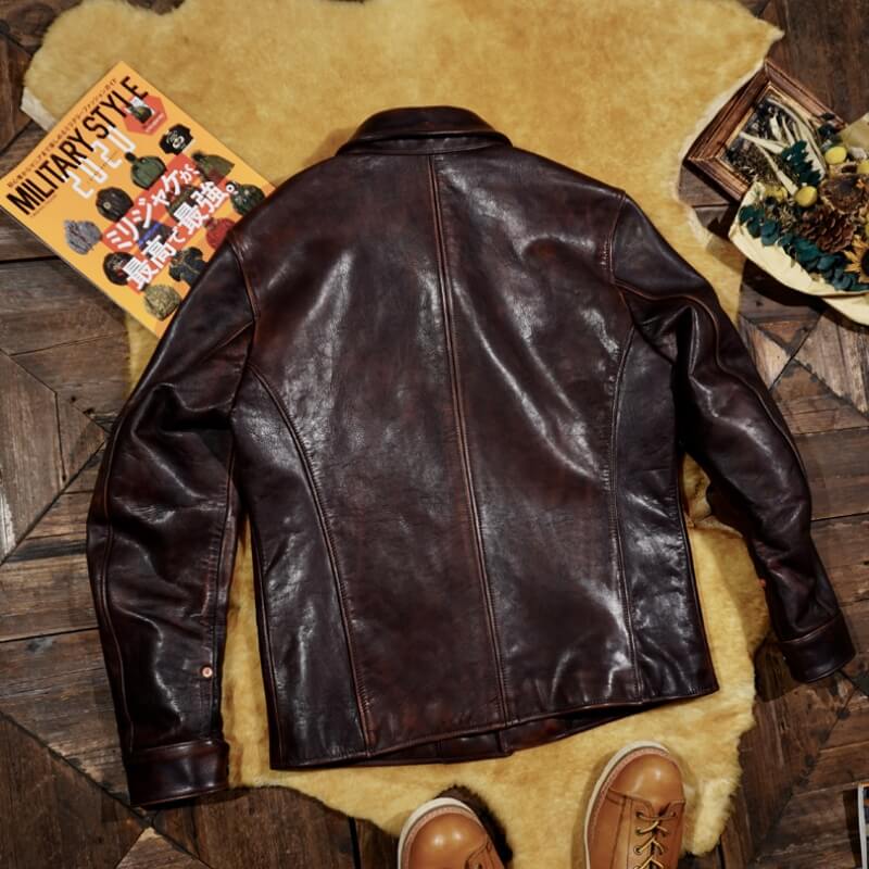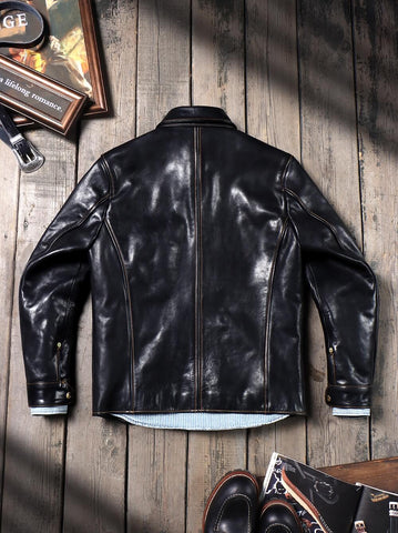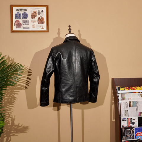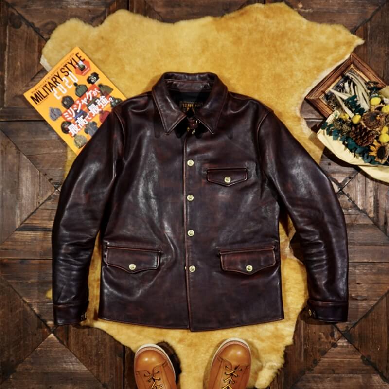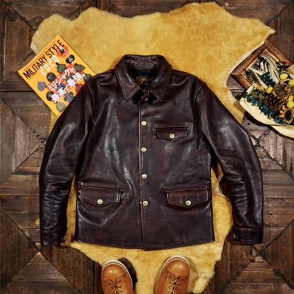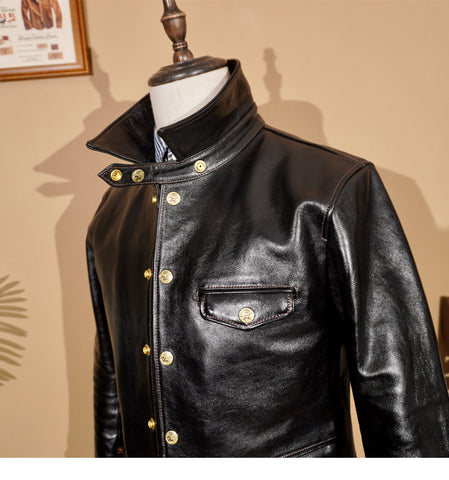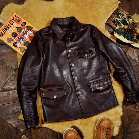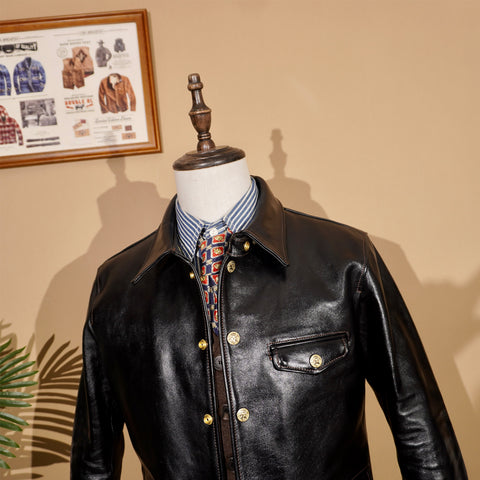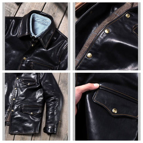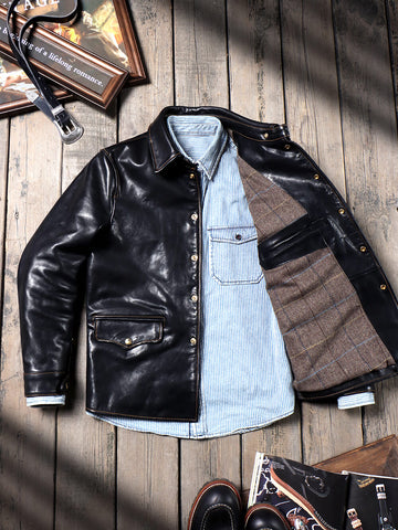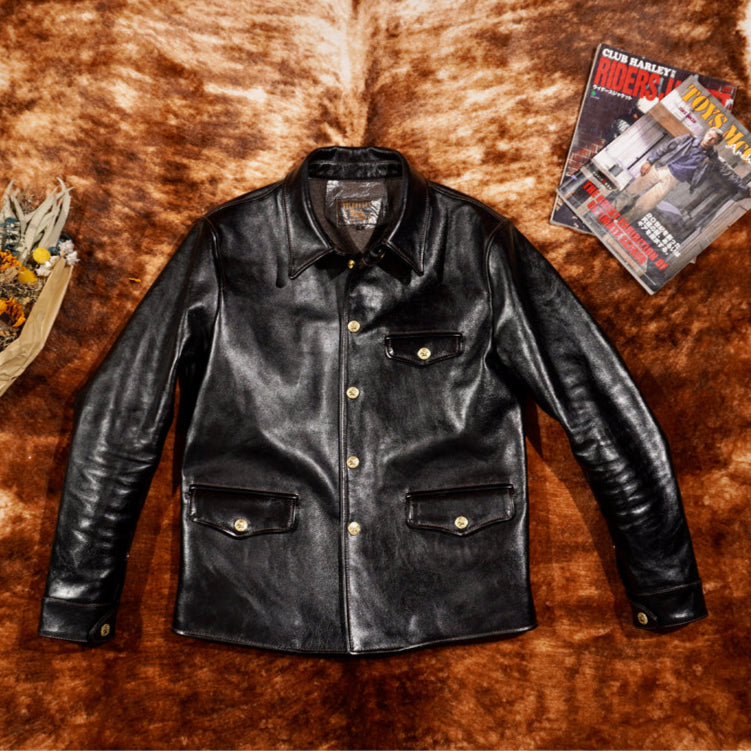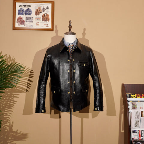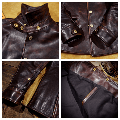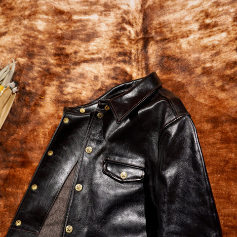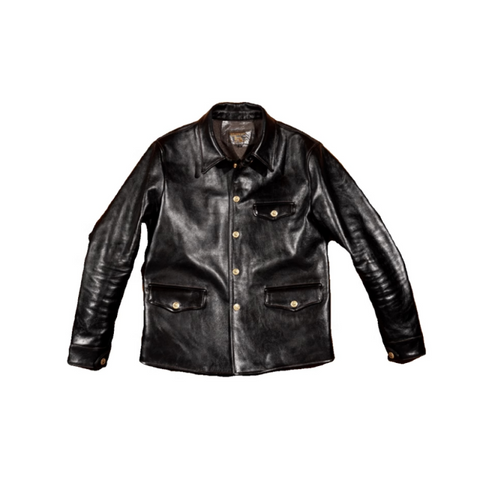 This classic brakeman leather jacket crafted from durable yet flexible 1.3mm vegetable tanned horsehide/1.4mm cowhide, feature brass button front closure, turn down collar, button cuffs and signature 3-button snap pockets.