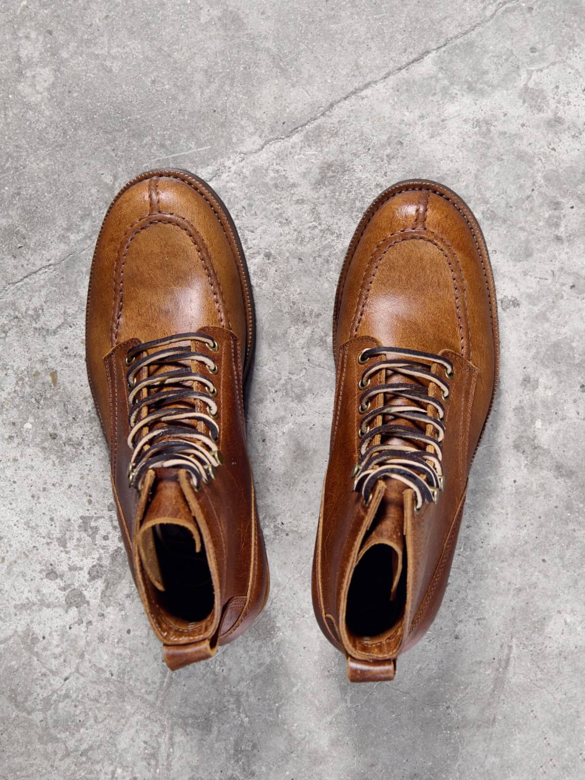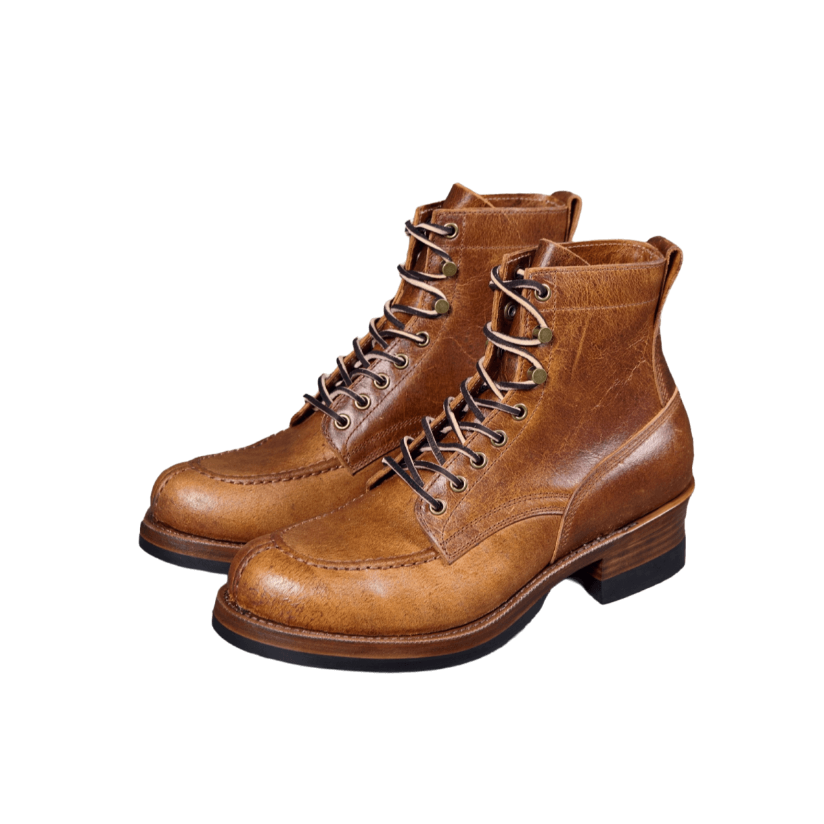 The Norwegian Toe Logger Boots are defined by their unique Crazy Cow leather. This exceptional hide is crafted by Charles F. Stead in England using a special flesh-out method and a wax-lock finishing technique. This process creates a rich, antique base that allows the leather to develop a deep, one-of-a-kind patina, meaning your boots gain character and beauty with every step.