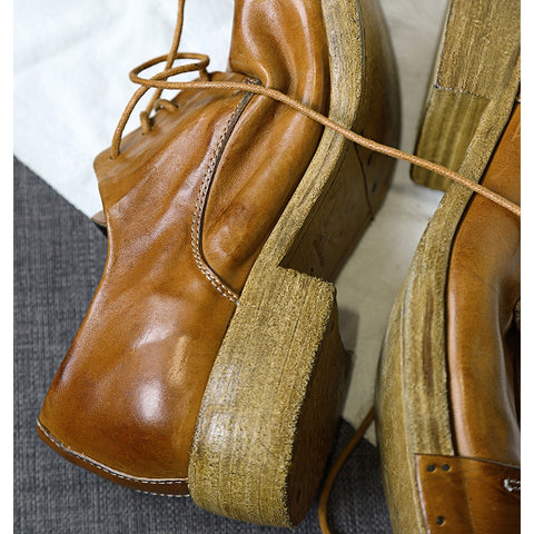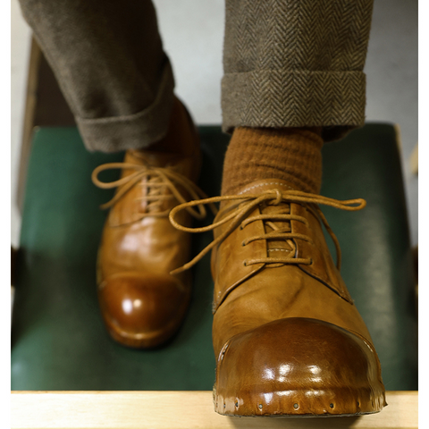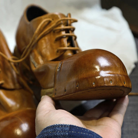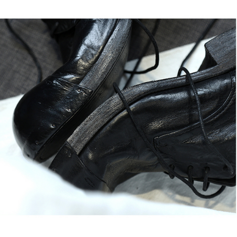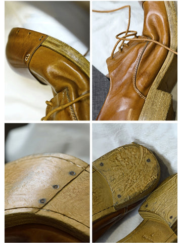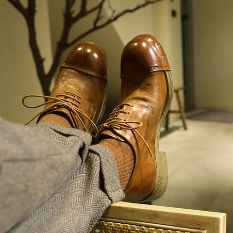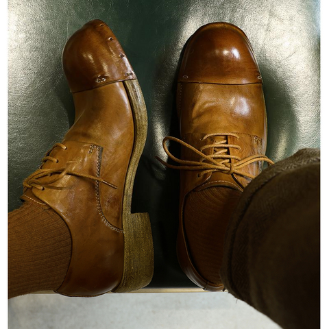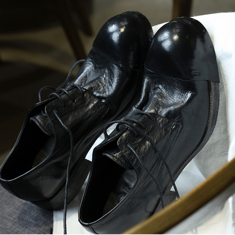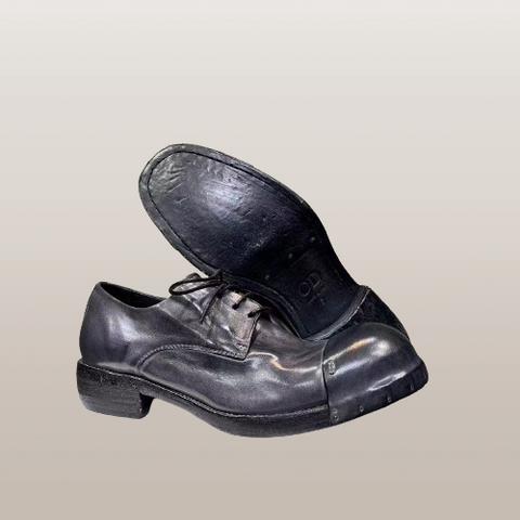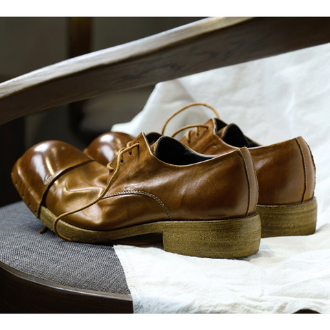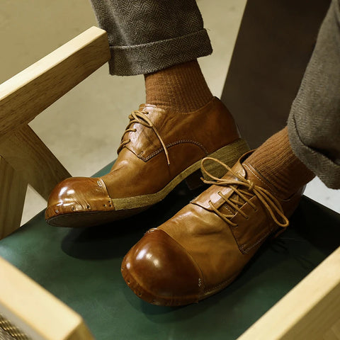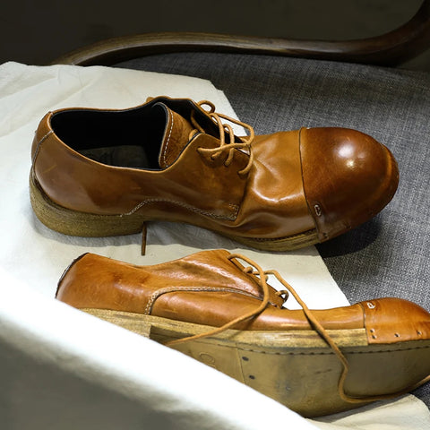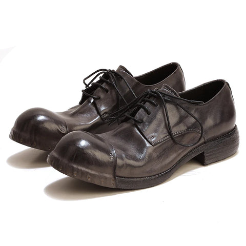 Elevate your style with these artisanal men's leather shoes. Crafted from premium horsehide uppers distressed with a wrinkle effect, they exude vintage charm. Rivet decorations add distinctive flair.