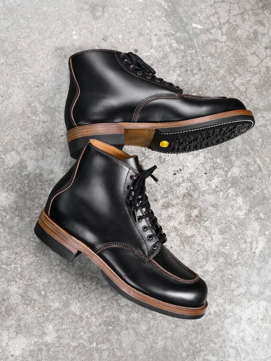 Introducing our Moc Toe Boots, crafted from premium black tea core cowhide for a sleek, rugged look. These boots feature a durable Vibram 435 lug sole, leather lining, and a comfortable leather insole, all built with Goodyear welted construction for exceptional longevity.