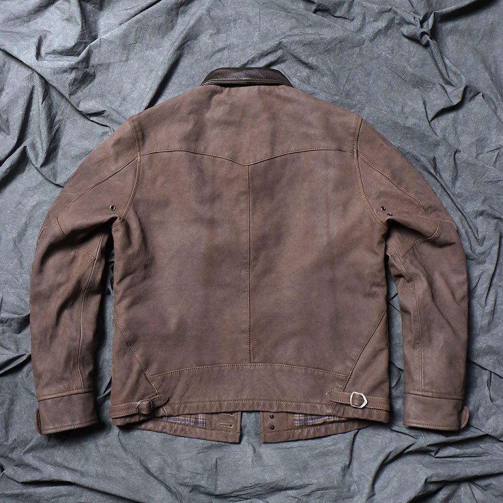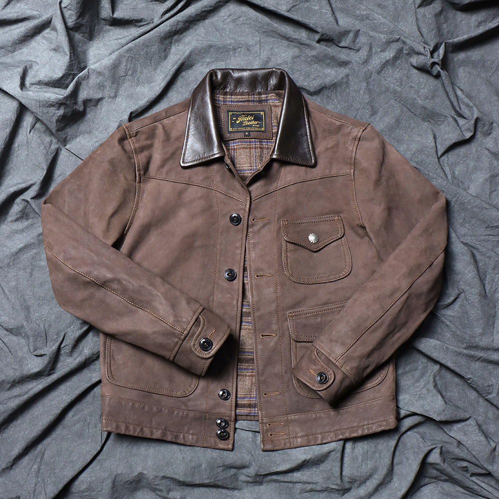 Men's light coffee-colored western leather jacket, crafted from soft, comfortable goatskin with cotton lining.