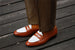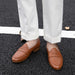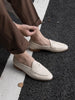 Embrace timeless style with our men's leather penny loafers. Premium cowhide uppers in versatile beige, rich brown, or two-tone white/brown. Classic penny slot detailing lends traditional flair. Leather insoles with cushioned footbeds provide superior comfort. Durable rubber soles offer traction. The perfect blend of casual and refined. Dress up any outfit with these sophisticated loafers. Exude dapper elegance from the office to evening affairs.