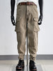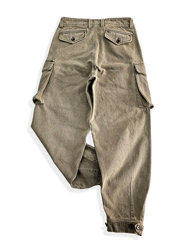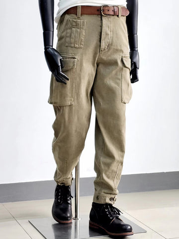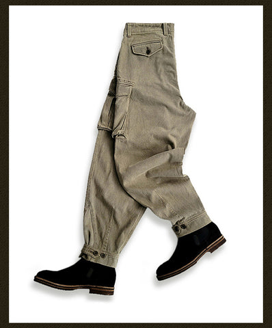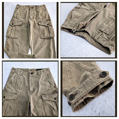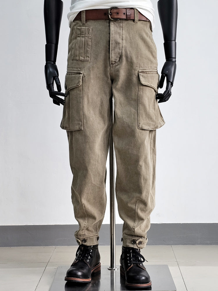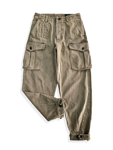Rugged utility work pants crafted from heavyweight 450gsm cotton. Washed for a distressed, lived-in look. Features 6 functional pockets: 2 side, 2 knee, and 2 hip for ample storage. Button cuffs add a classic touch. Pencil pants pattern offers a modern, tapered silhouette. Combines durability with style for the ultimate work-ready trousers. Inspired by ground crew trousers.