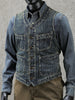 Men's Striped Denim Vest: 12oz denim with vintage flair. V-neck design, discharge print for distressed look. Brass buttons, 4 pockets, and adjustable buckleback. American retro style meets modern function. Perfect for layering or solo wear. Rugged charm in a versatile, heavyweight vest that embodies classic workwear aesthetics.