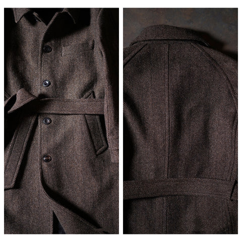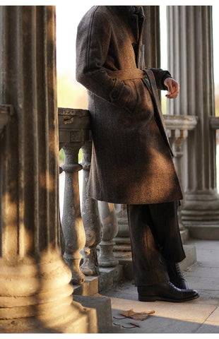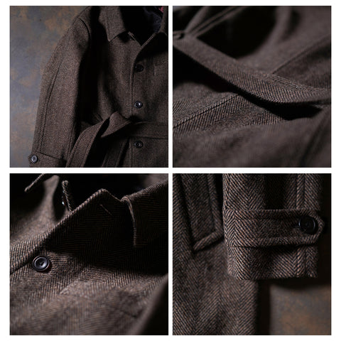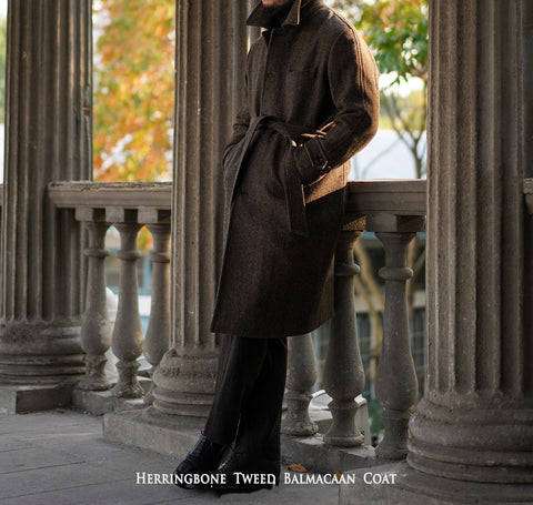Découvrez notre manteau en tweed à chevrons Balmacaan pour homme, un classique intemporel. Fabriqué en 100 % laine tweed luxueuse de 720 g/m² avec une doublure en bemberg, il respire le charme vintage. Il comprend une fermeture à boutons, une boucle en corne, 2 poches en biais, une ceinture et une chaleur exceptionnelle. Rehaussez votre style avec ce pardessus classique, semi-formel et élégamment confectionné.