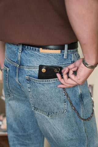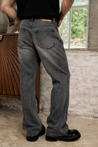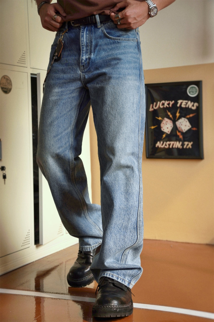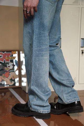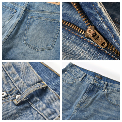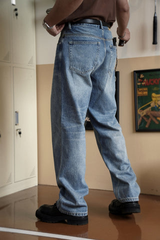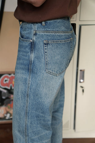 Intemporel et confortable, ce jean délavé est un incontournable de votre garde-robe. Fabriqué en denim robuste 14 oz dans un délavage bleu clair et gris classique. Taille mi-haute avec une coupe droite décontractée. Deux poches latérales, une poche intérieure sur le devant et deux poches plaquées à l'arrière. Parfaitement usé sans être trop usé - le pantalon décontracté idéal pour un usage quotidien.