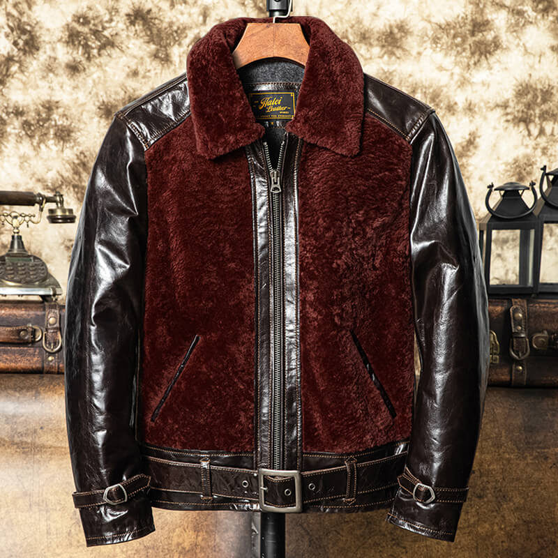 Cette veste en cuir pour homme de style grizzly associe fourrure de mouton marron et cuir de vachette couleur café, doublure en coton, deux poches intérieures, deux poches obliques à la taille, fermeture à glissière, ceinture à la taille et boutons de manchette à boucle. S'inspirant du style robuste de la veste grizzly classique, elle allie praticité et masculinité pour des vêtements d'extérieur polyvalents pour temps froid.