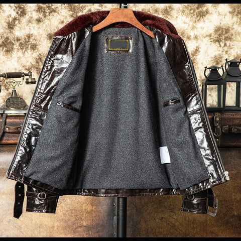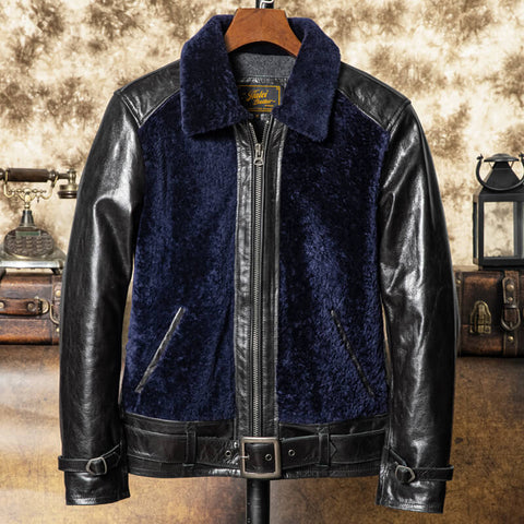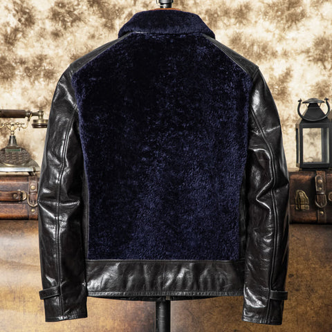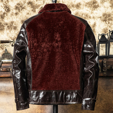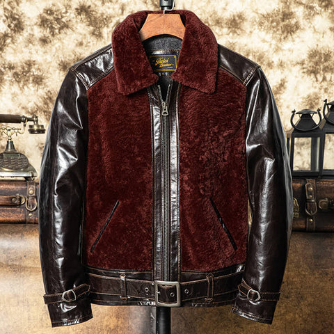 Cette veste en cuir pour homme de style grizzly associe fourrure de mouton marron et cuir de...