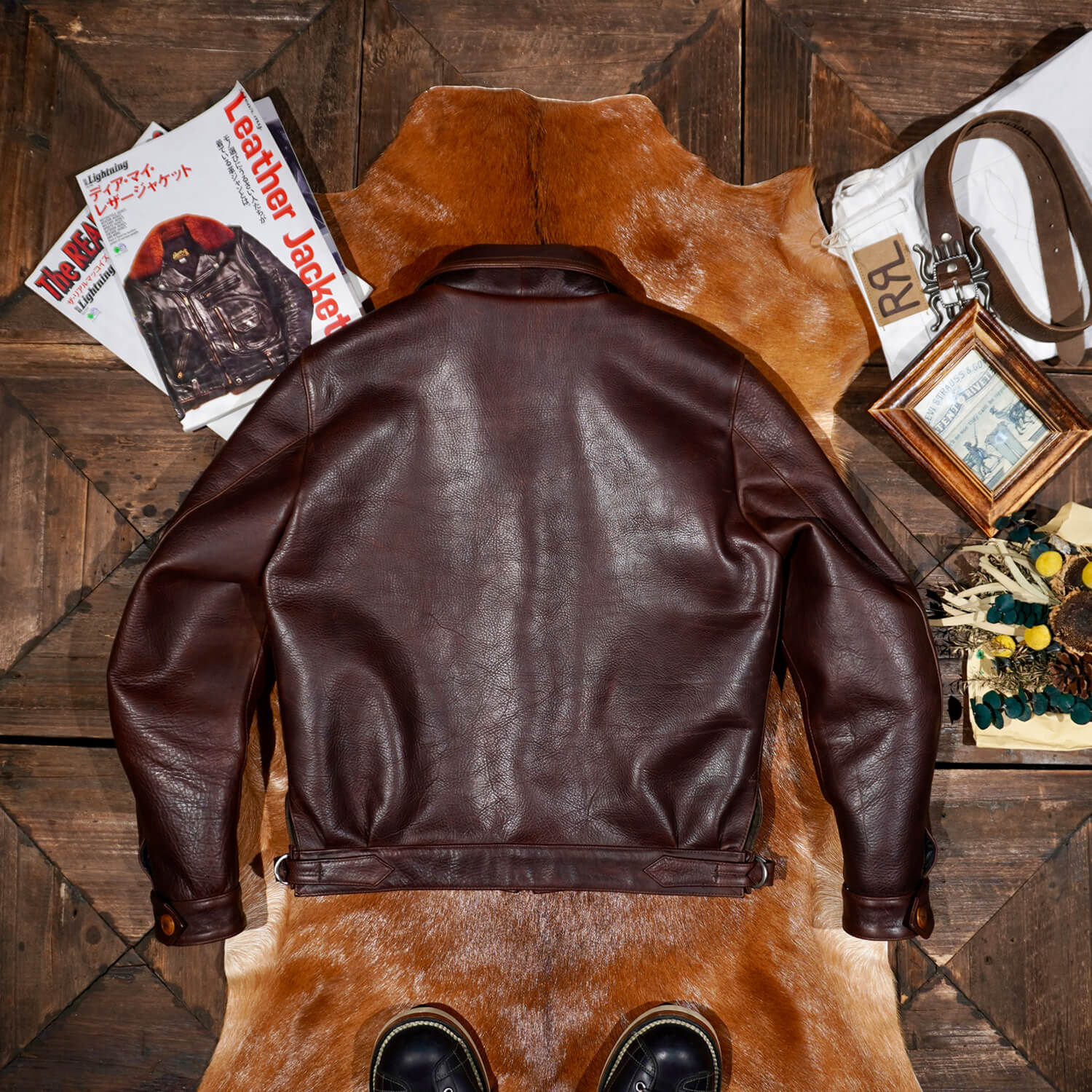 Inspiré des vestes du pilote allemand Hartmann, ce blouson aviateur pour homme est confectionné en cuir de cheval ciré japonais souple de 1,3 mm avec une doublure en coton. Il comprend deux poches poitrine zippées, deux poches inférieures à bouton-pression et une ceinture à boucle réglable autour de la taille pour un ajustement sûr et personnalisable. La silhouette emblématique du blouson aviateur fusionnée avec du cuir de cheval ciré robuste et des détails militaires crée une veste à la fois élégante et résistante, adaptée au ciel ou à la rue.