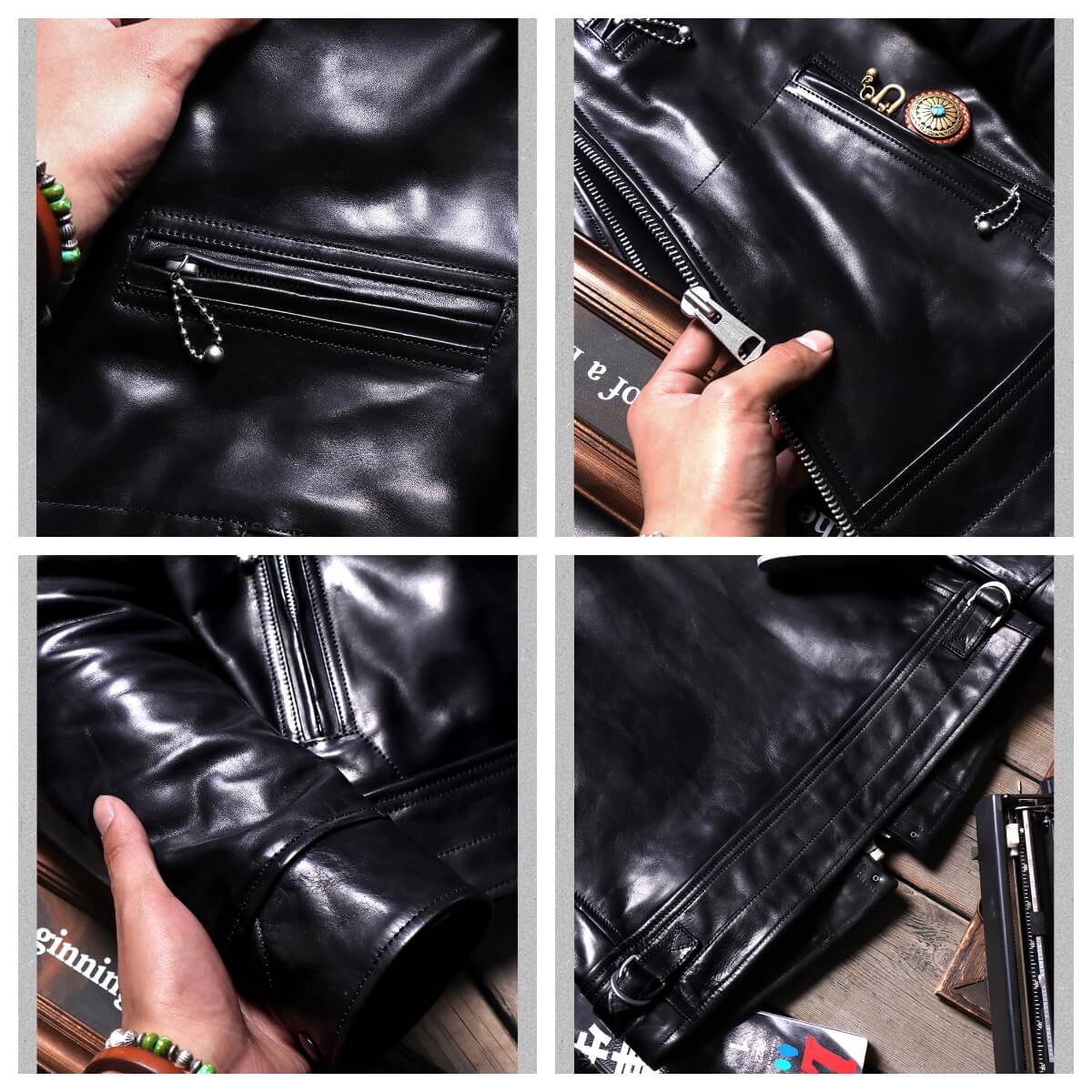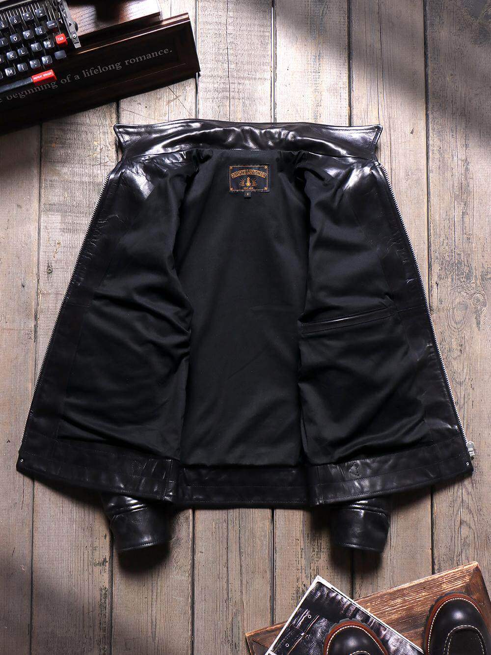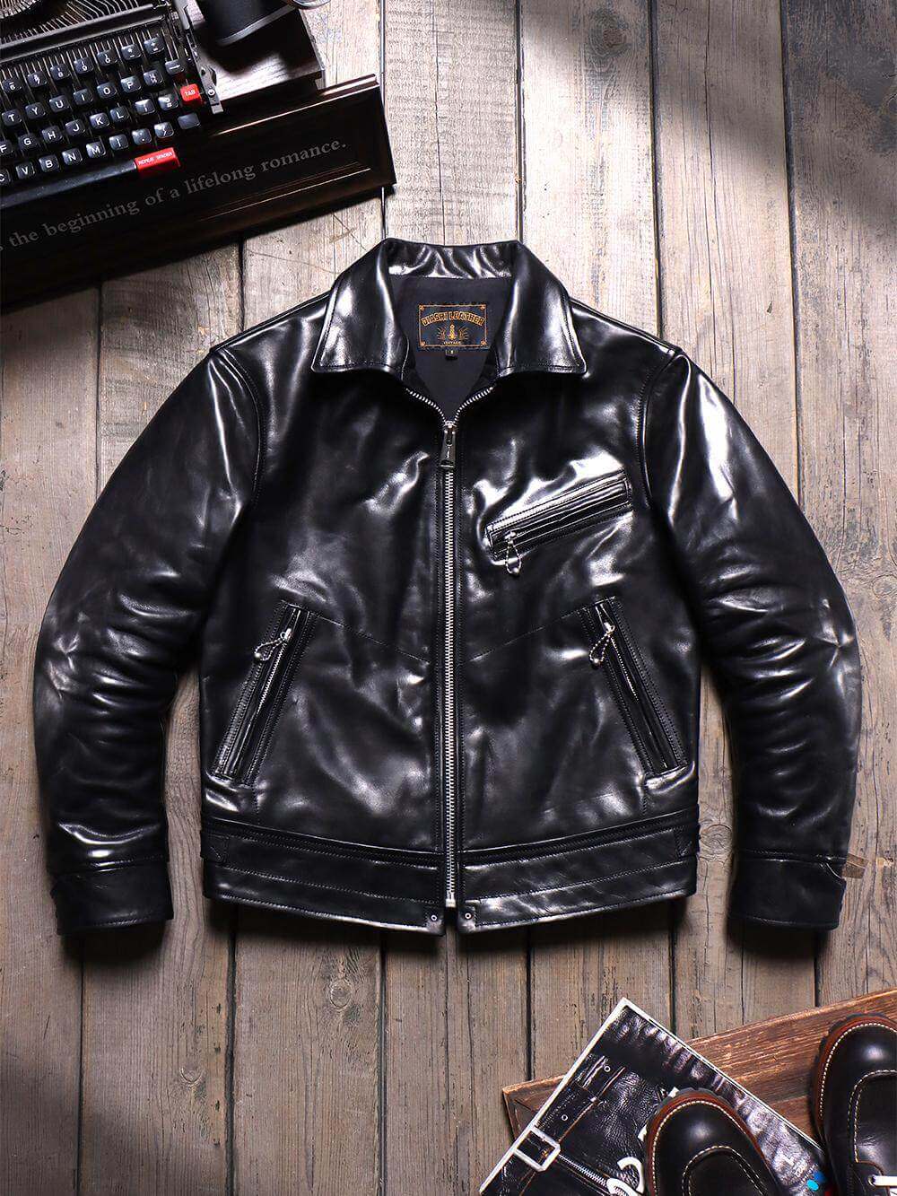 Notre veste de sport en cuir des années 1930 se décline en deux styles emblématiques : un cuir de cheval ciré de 1,3 à 1,5 mm d'épaisseur avec une patine robuste qui développe un lustre riche au fil du temps, ou un cuir de vachette non enduit de 1,3 mm qui conserve sa texture souple et brute. Les deux présentent une coupe vintage ajustée avec un col ouvert, une fermeture zippée sur le devant, trois poches zippées et des boucles en laiton réglables dans le dos. Le cuir de cheval offre une résistance à l'eau robuste tandis que le cuir de vachette offre un aspect cuir brut authentique. Inspiré de la veste en cuir Mulholland classique.