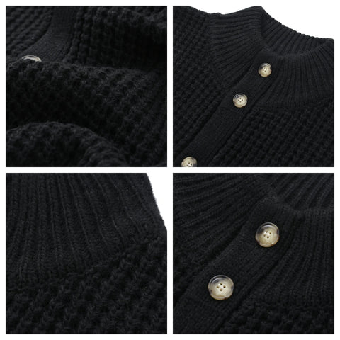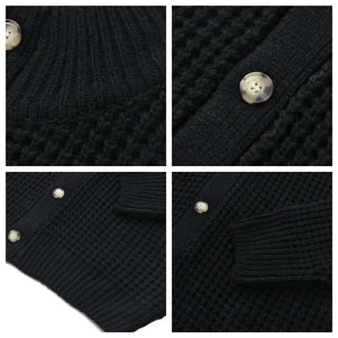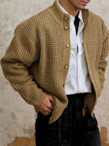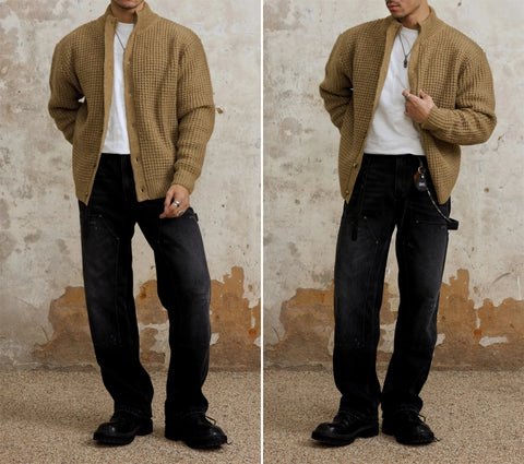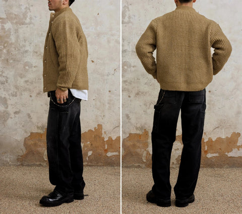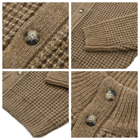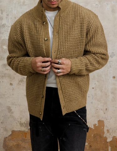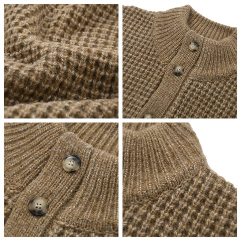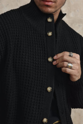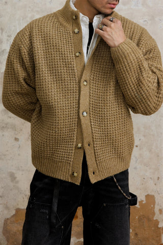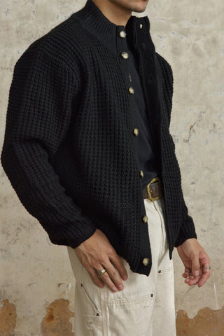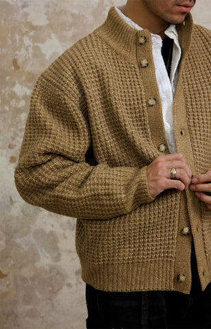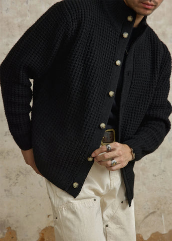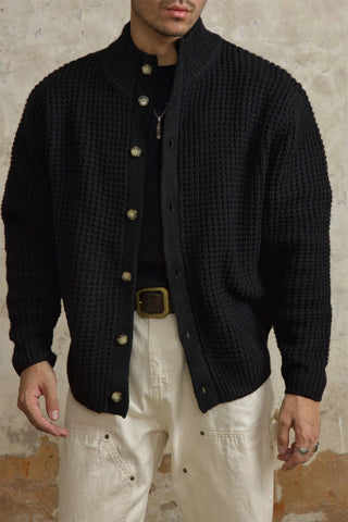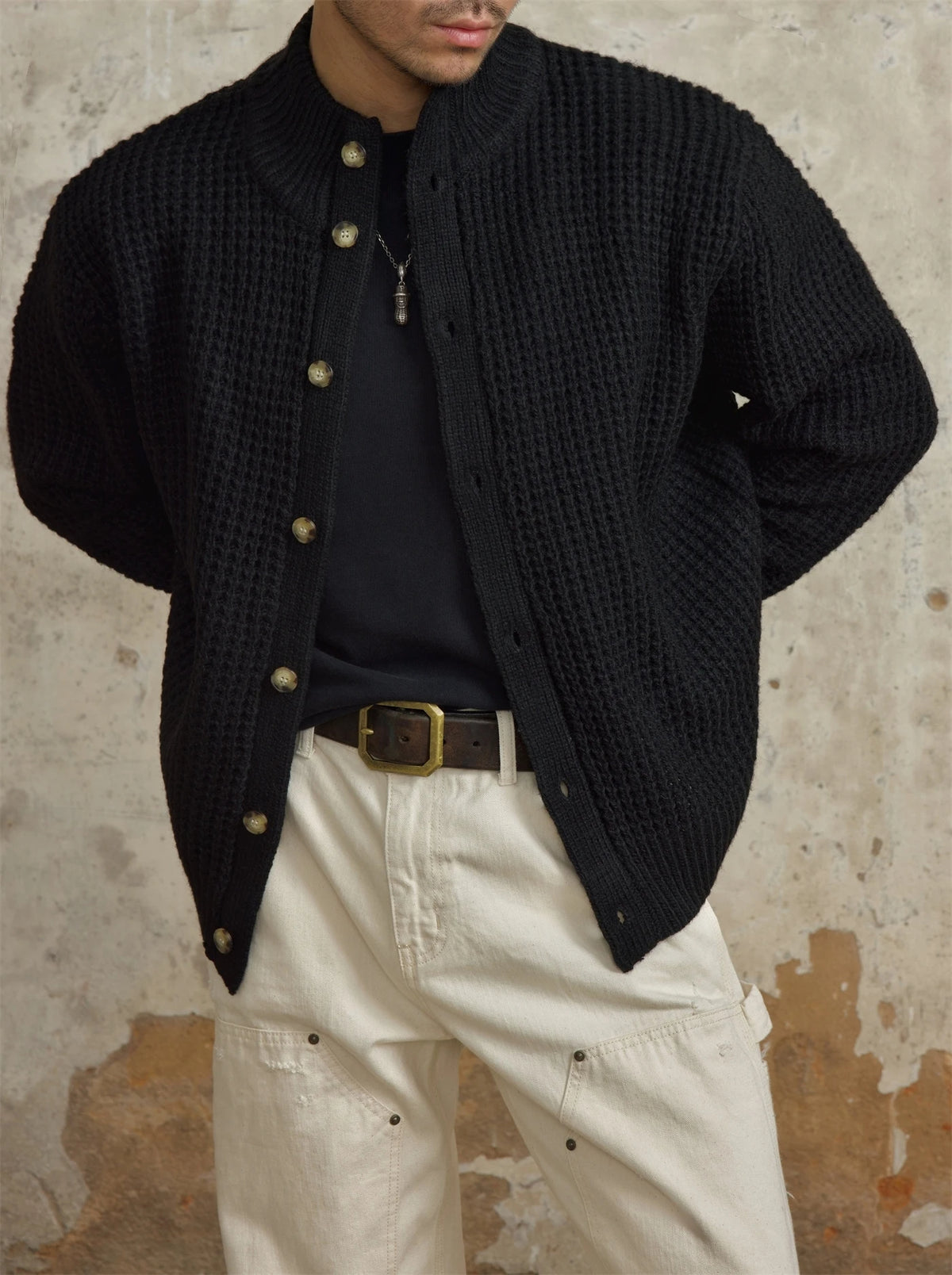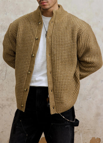Ce cardigan gaufré ample en tricot pour homme vous garde au chaud dans un mélange de laine/polyester/nylon respirant 30/25/45. Avec un motif gaufré épais et texturé, il offre l'équilibre parfait entre chaleur et confort. Il est doté d'un col montant côtelé et d'une fermeture à boutons durable. Le mélange de laine et la construction tricotée offrent de la chaleur sans surchauffer. Disponible en noir polyvalent ou en camel naturel, il se superpose magnifiquement sur des t-shirts, des flanelles ou des pulls pour un look intemporel et sophistiqué.