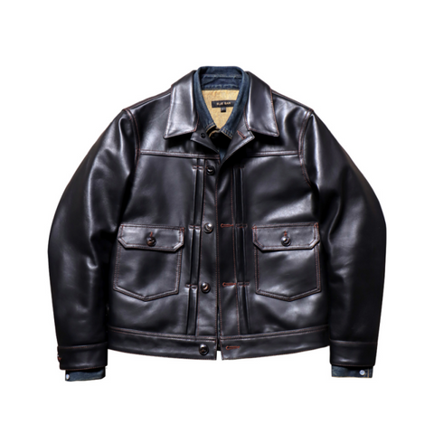 Veste en cuir noir style camionneur pour homme en cuir de vachette tanné italien à la fois résistant et doux avec doublure en coton. Comprend une fermeture boutonnée sur le devant, deux poches poitrine à rabat pressionné. Coupe dans un modèle de veste en jean 507XX classique des années 1960 avec des détails de couture avant et arrière emblématiques. Évocatrice des jours de gloire des légendes du rock et des rebelles portant du cuir sur la route. Une interprétation en cuir vintage et cool d'une silhouette de veste de camionneur en jean emblématique, parfaite pour un usage quotidien.
