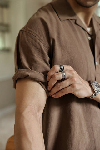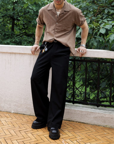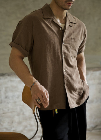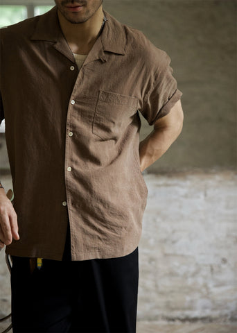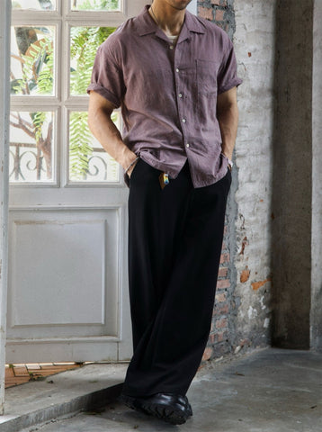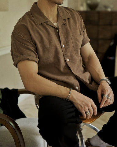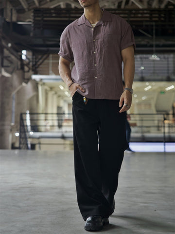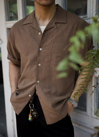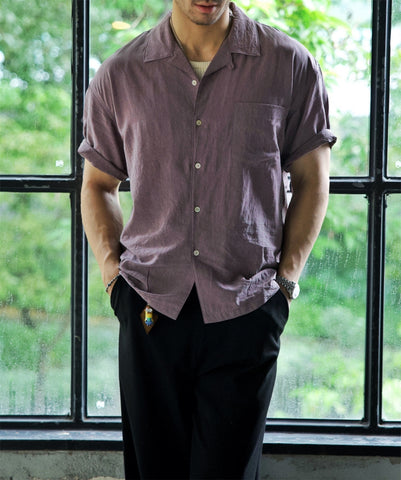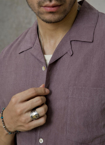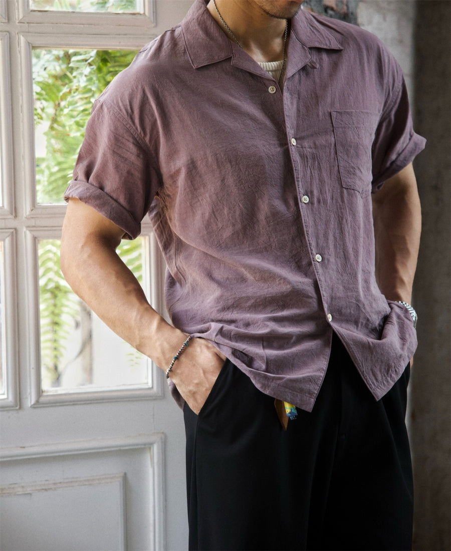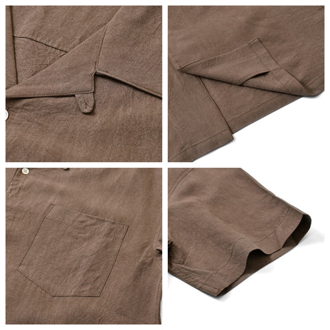 Adoptez l'été dans un confort suprême avec notre chemise à col camp pour homme, confectionnée à partir de fibres de modal lyocell, des fibres cellulosiques régénérées réputées pour leur douceur exquise et leur nature douce pour la peau. Dotée de manches courtes, de boutons en nacre et d'une seule poche poitrine, cette chemise respire la sophistication décontractée. Disponible dans des teintes violet clair et café clair, c'est l'essentiel d'été parfait pour un style sans effort.