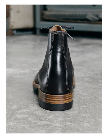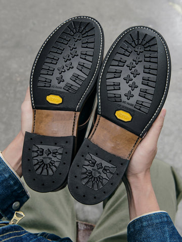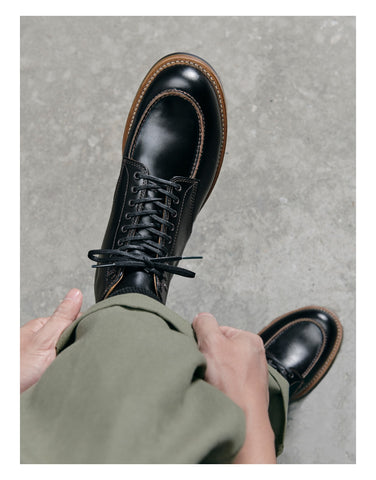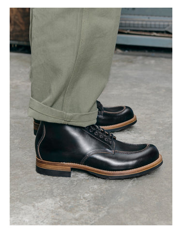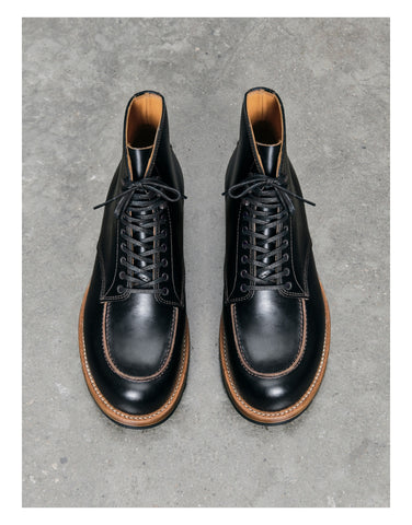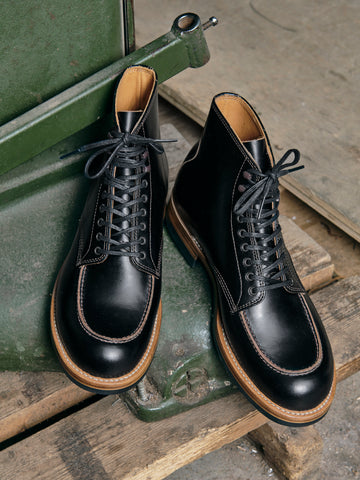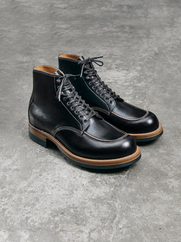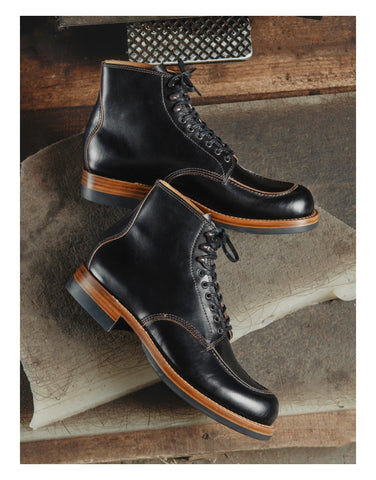 Introducing our Moc Toe Boots, crafted from premium black tea core cowhide for a sleek, rugged look. These boots feature a durable Vibram 435 lug sole, leather lining, and a comfortable leather insole, all built with Goodyear welted construction for exceptional longevity.