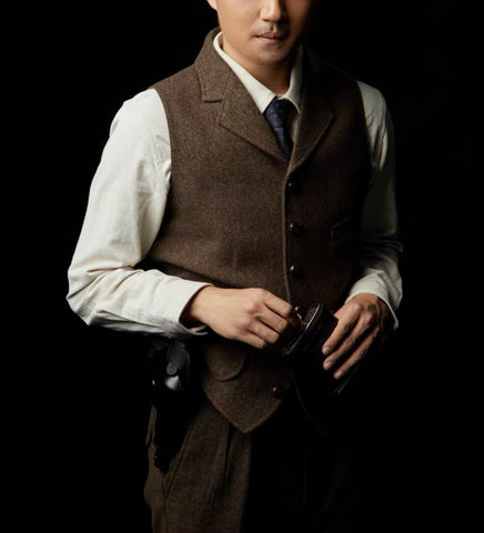 メンズ ブラウン ツイード ハンティング ベストのご紹介です。クラシックなスタイルとモダンな職人技が融合した、時代を超えた一着です。100% ウール (480gsm) で作られ、100% ベンベルグの裏地と牛革編みボタンで飾られています。19 世紀のイギリスとアメリカのハンティング ベストにインスピレーションを受けています。ノッチ ラペルでスタイルを格上げ。本物の伝統ファッションで冒険を満喫してください。