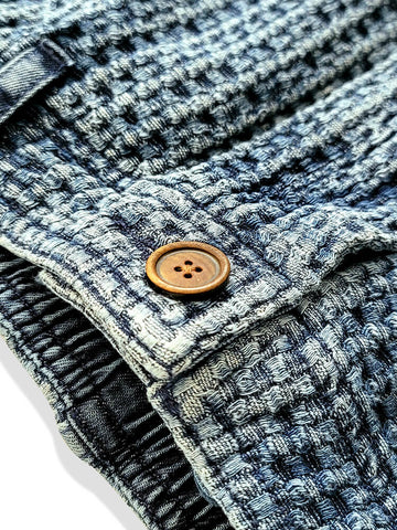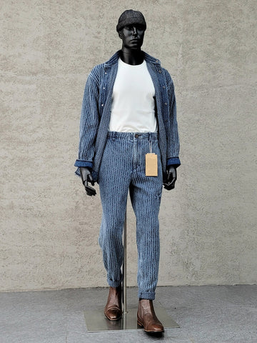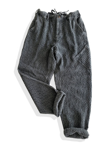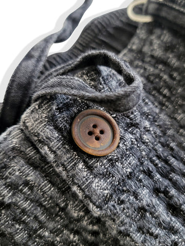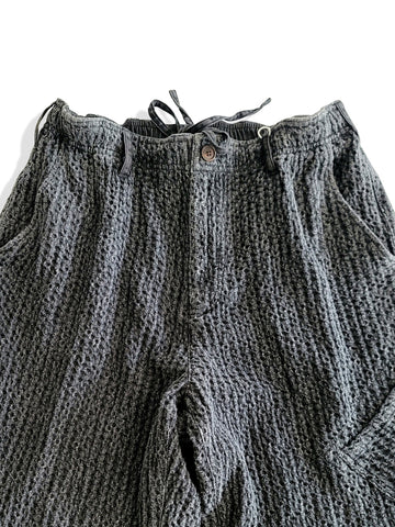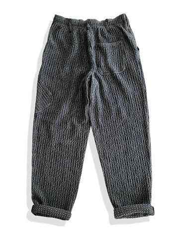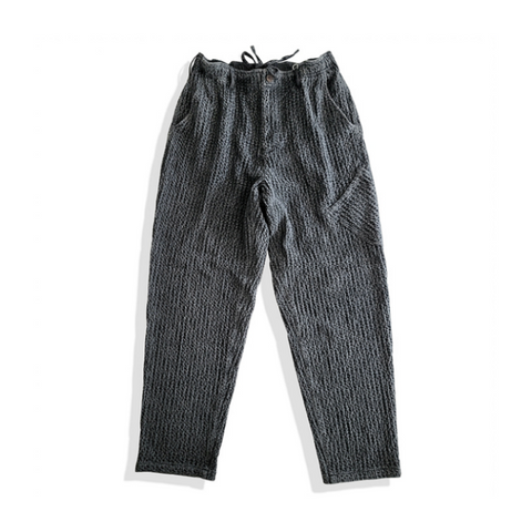 日本の伝統的な作業着からインスピレーションを得たこのメンズパンツは、柔らかくて着慣れた感じのウォッシュ加工の黒の 100% コットンで作られています。ヒップから太ももにかけてゆったりとしたフィット感で、脚はテーパードしたデザインです。快適さと実用的なスタイルの完璧な融合です。