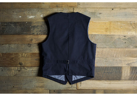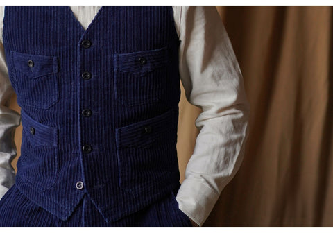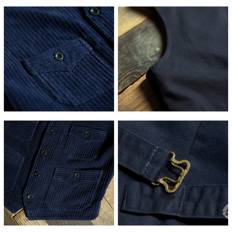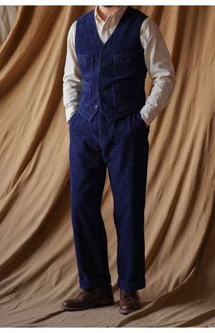 男性用インディゴ染め V ネック コーデュロイ ワークベスト。フロントはコーデュロイ、バックはコットンツイル、裏地はシャンブレー、ダメージ加工の真鍮製バックルバック、ホーンバックル、胸ポケット 2 つとウエストポケット 2 つ。フランスのワークウェア風スタイル。