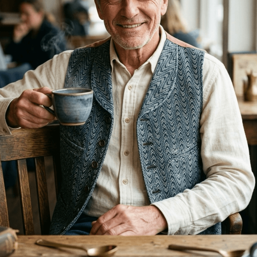 メンズ インディゴ ショールカラー ジャカード ベストで洗練された雰囲気を味わってください。綿 95%、再生繊維 3.2%、ポリエステル 1.8% で完璧に作られたこの 10.8 オンスのベストは、魅力的な波模様が特徴です。ボタン留めとスリムフィットで、スタイルと快適さが融合しています。