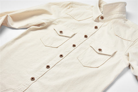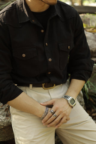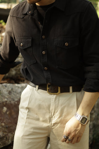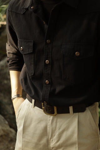 当社のメンズ ブッシュ シャツで、無骨な魅力を堪能してください。耐久性のある 9.5 オンスのコットンで作られたこの長袖の傑作は、本物らしさを醸し出しています。胸ポケット 2 つと真鍮のバックルが付いており、スタイルと機能性が自然に融合されています。レギュラー フィットで一日中快適に着用できます。あなたの中に眠るカウボーイを解き放ち、大胆な主張をしましょう。