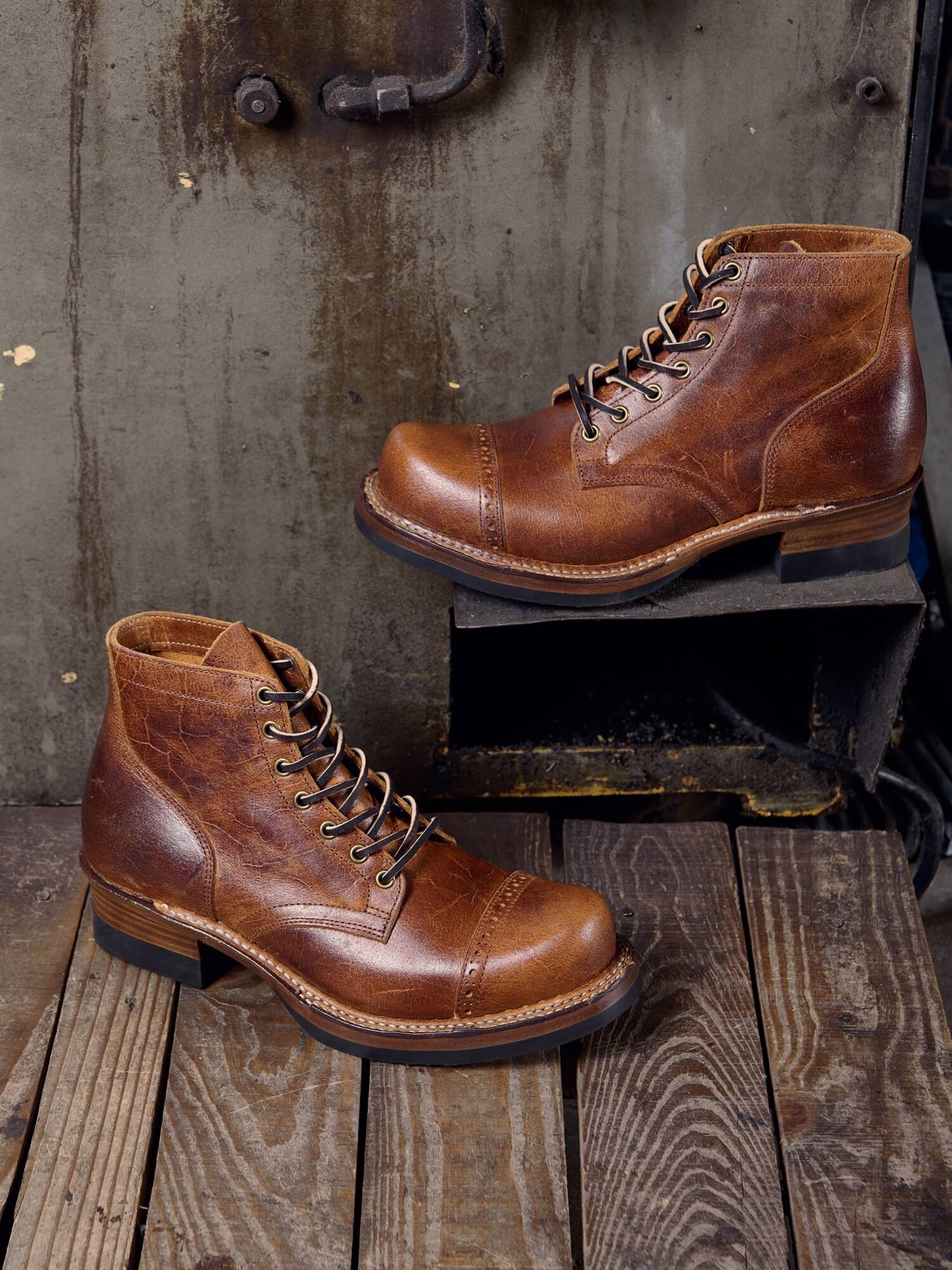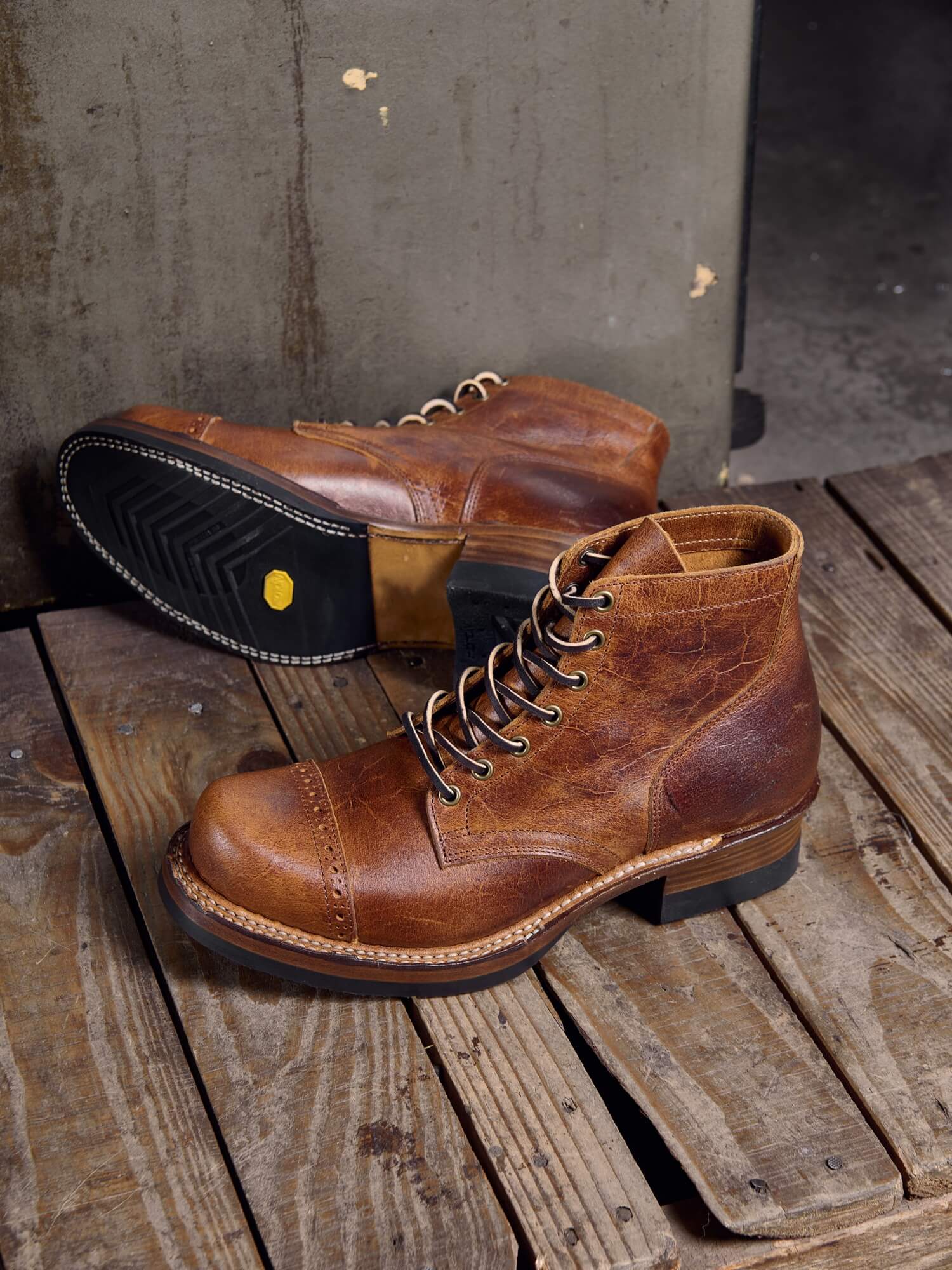 Men's Lumberjack Boots are built for enduring comfort and rugged style. They feature our premium "flesh-out" Crazy Cow leather from Charles F. Stead, which develops a rich, unique patina over time. A special finishing technique locks wax between the natural antique base and the top coat, allowing the boots to age beautifully and deepen in character with wear.