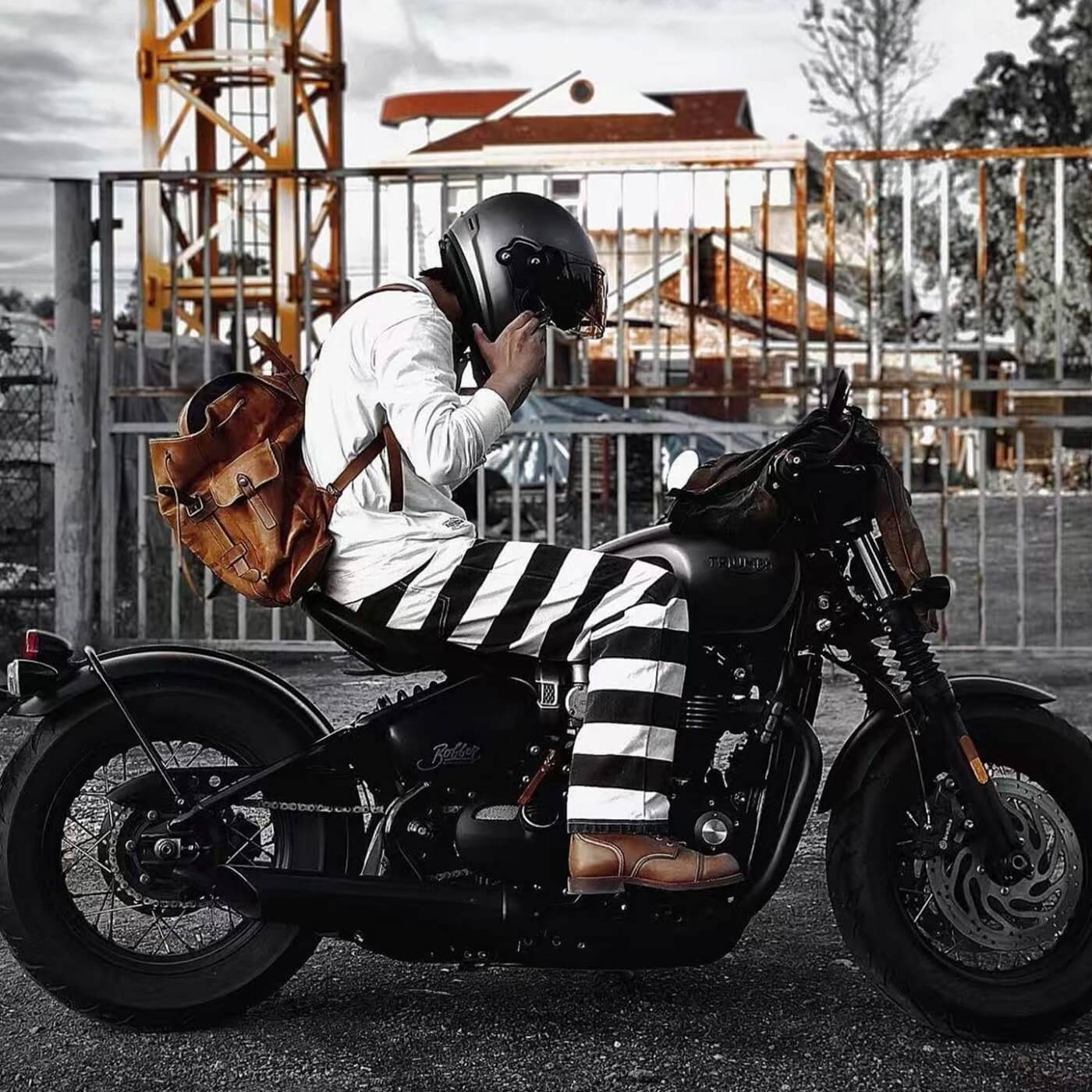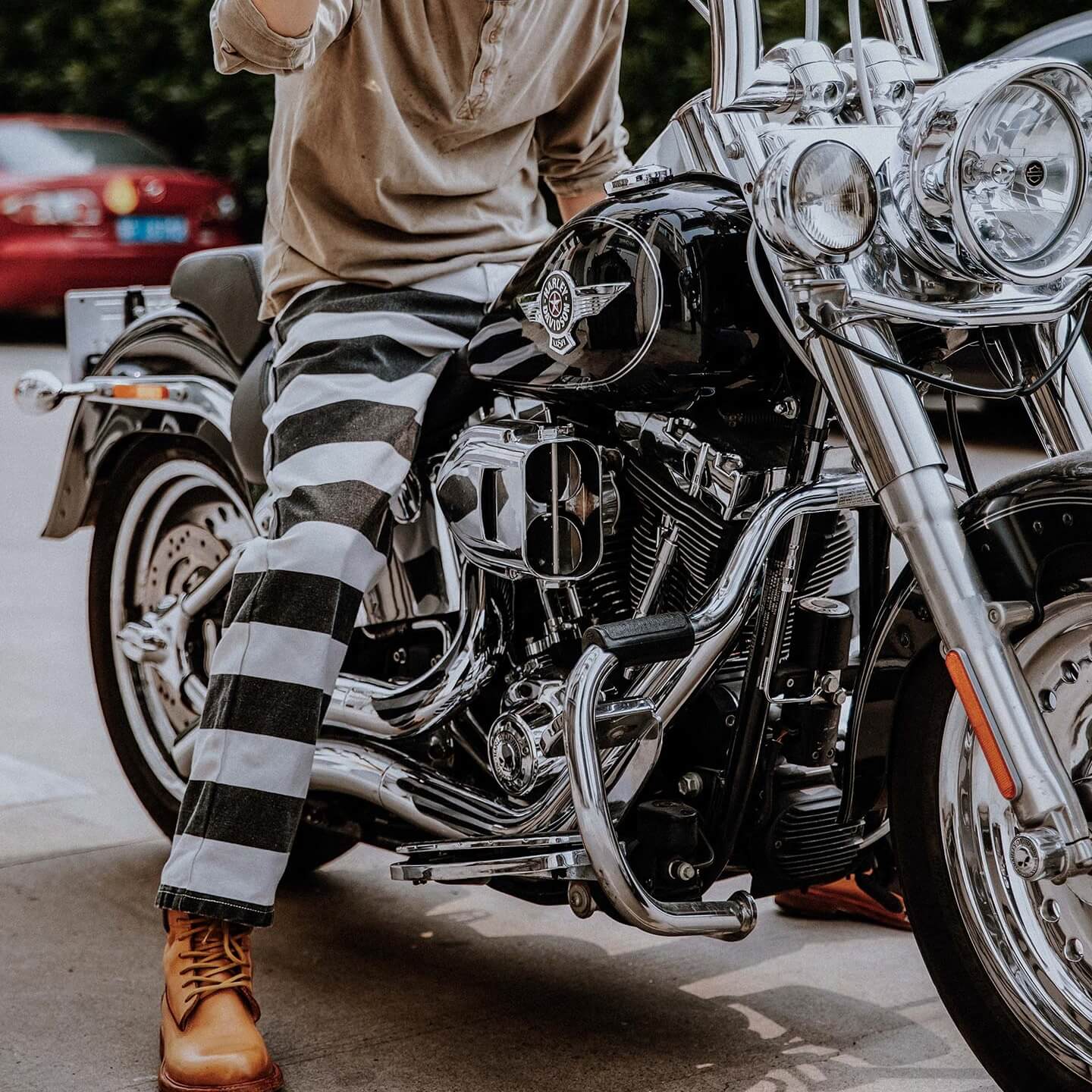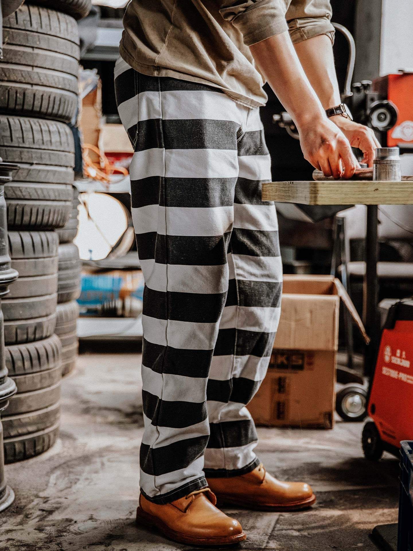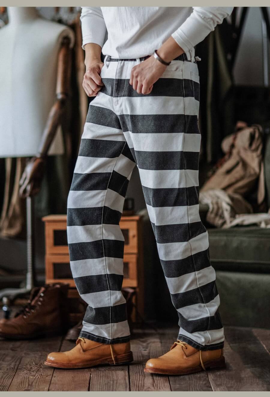 メンズ ストライプ モーターサイクル パンツ - 頑丈なバイカー スタイル。16 オンスの厚手のキャンバス生地に大胆な囚人ストライプ パターンを施して作られています。ジッパー フライと真鍮のバックルでフィット感を調節できます。フロント ポケット 3 つとヒップ ポケット 2 つで十分な収納力があります。ビンテージ モーターサイクル アパレルからヒントを得た、モダンでエッジの効いたデザイン。丈夫なキャンバス構造で、ライダーにもライダーでない人にも長持ちする品質を保証します。バイクでクルージングするときも、街を走るときも、このストライプのモト パンツは、雰囲気と個性を醸し出します。