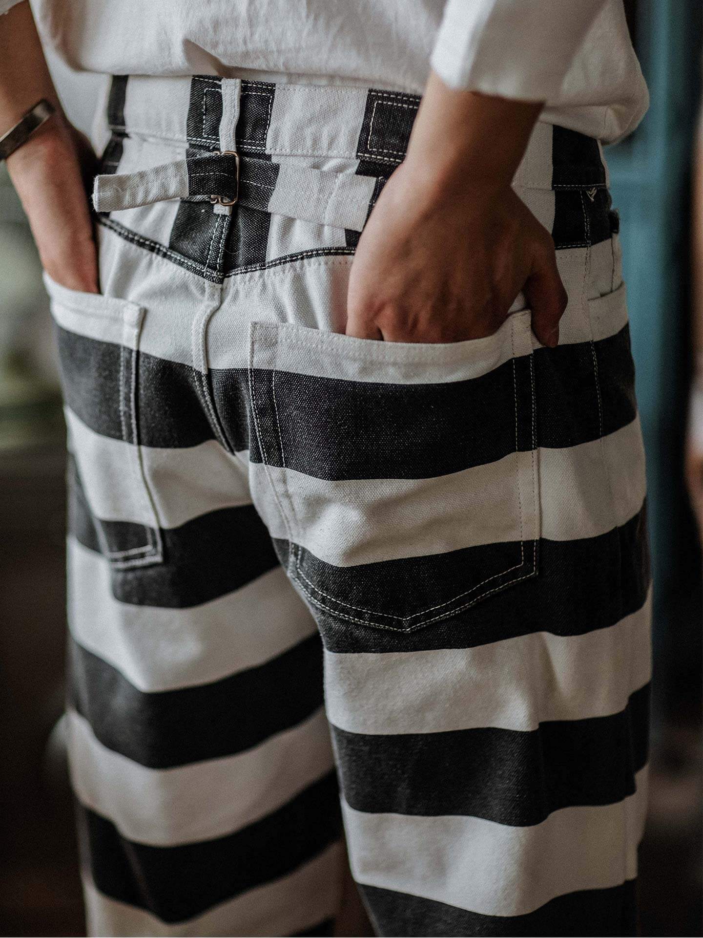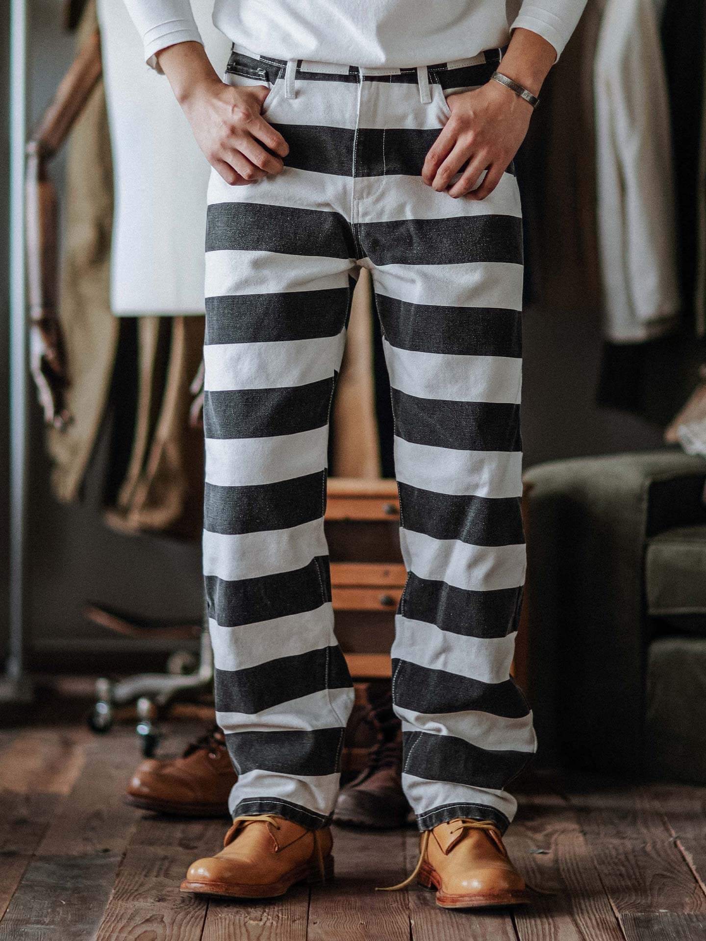 メンズ ストライプ モーターサイクル パンツ - 頑丈なバイカー スタイル。16 オンスの厚手のキャンバス生地に大胆な囚人ストライプ パターンを施して作られています。ジッパー フライと真鍮のバックルでフィット感を調節できます。フロント ポケット 3 つとヒップ ポケット 2 つで十分な収納力があります。ビンテージ モーターサイクル...