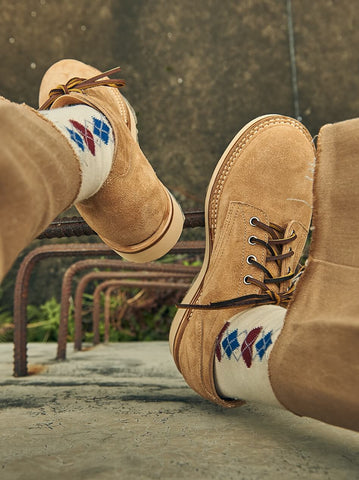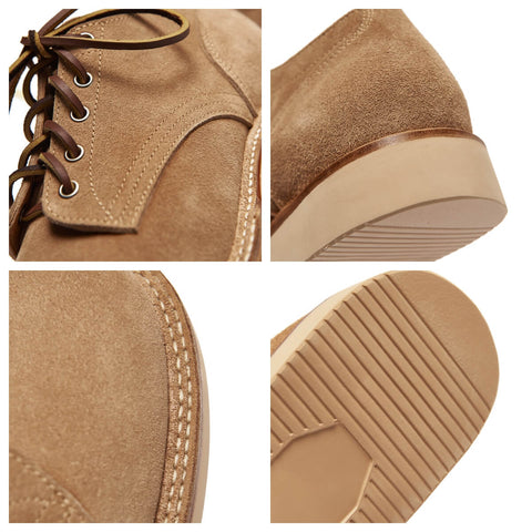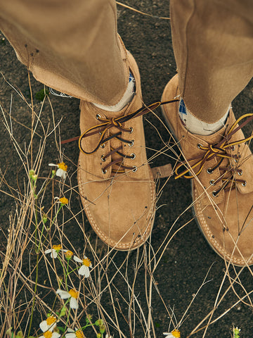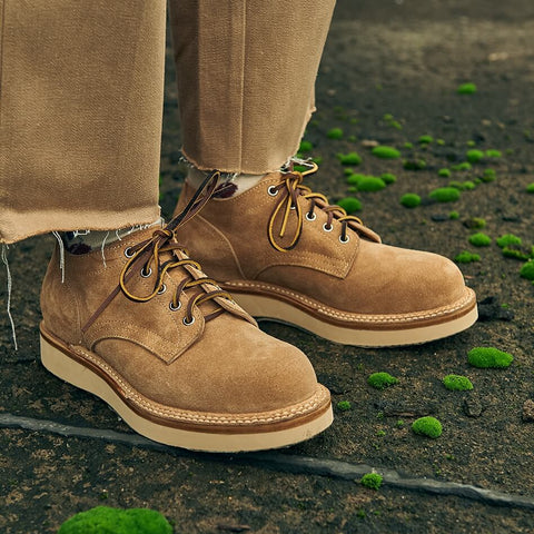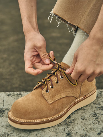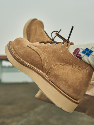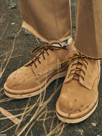 Meticulously handcrafted from premium Korean sourced suede in a warm sand hue, these derbies offer effortless versatility. The rugged stitchdown construction ensures exceptional durability, while the lightweight 2021 wedge sole provides all-day comfort and traction.