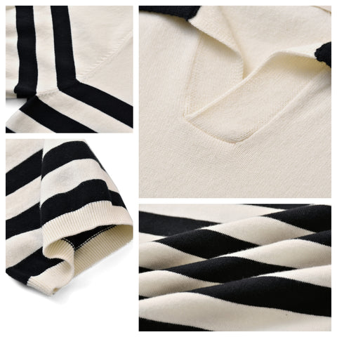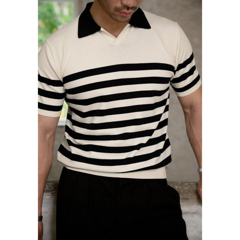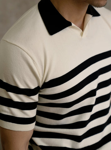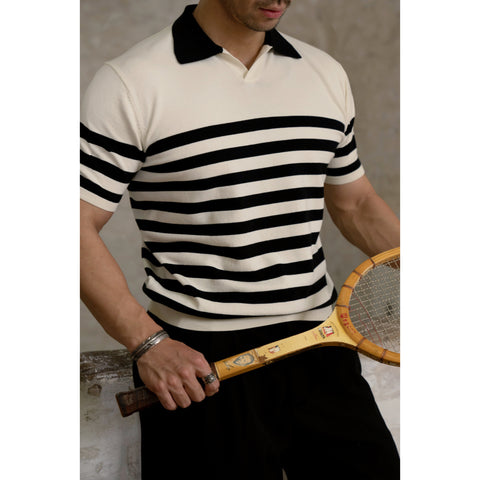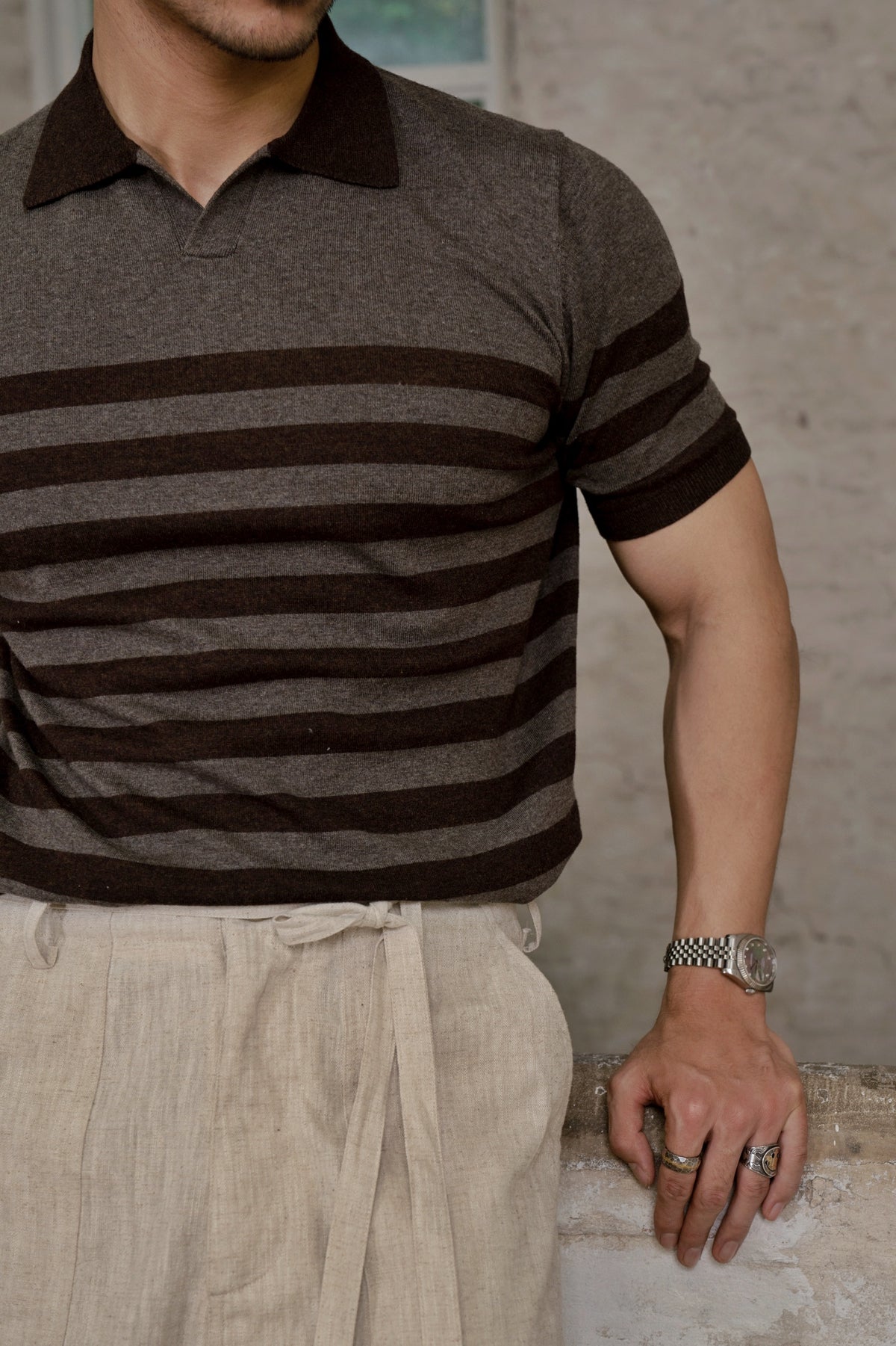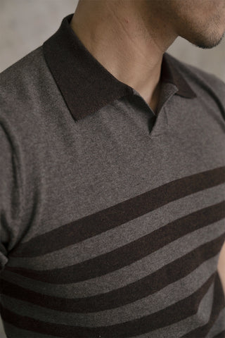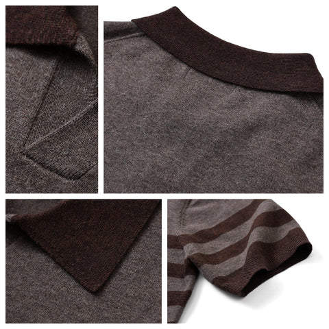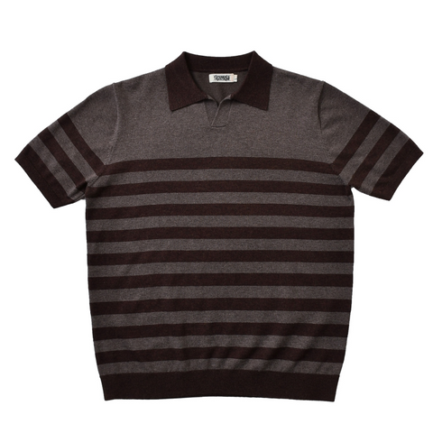 しっかりとした 300 gsm コットン生地、ブラウン/ホワイトのストライプ。オープンカジュアルカラー、半袖。通気性、柔らかさ、耐久性に優れたピケニット構造。ゆったりとしながらもスタイリッシュな定番ポロシャツ。クラシックなストライプ柄、快適なリラックスフィット。
