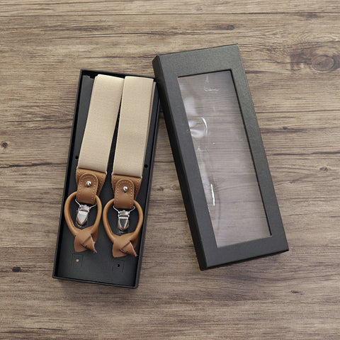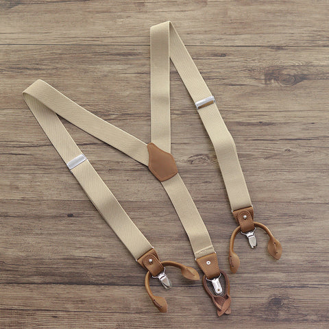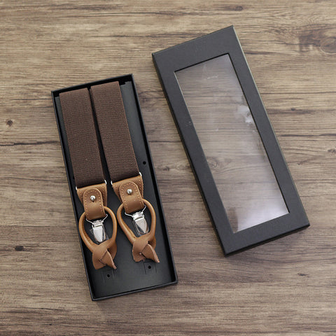 男性用調節可能サスペンダー: 金属製クリップ留め具でユニバーサルサイズ。クラシックな外観の本物の革製バックル。カーキ、ブラウン、ネイビーの 3 色展開。一日中快適に着用できる伸縮性のある丈夫なサスペンダー。ビンテージ風の装いを完成させる、時代を超えたメンズ アクセサリー。