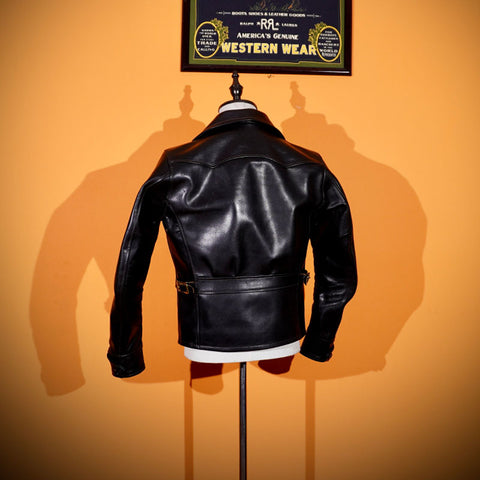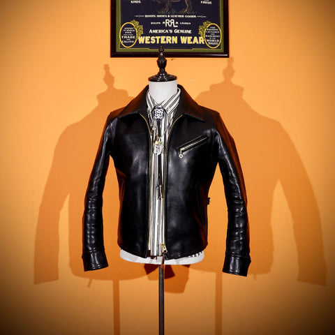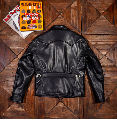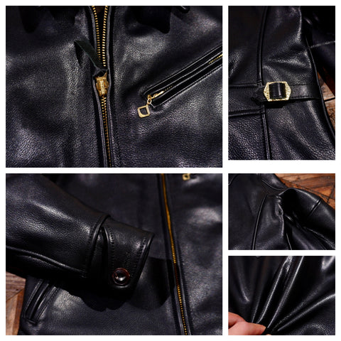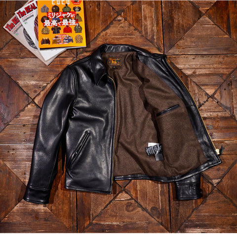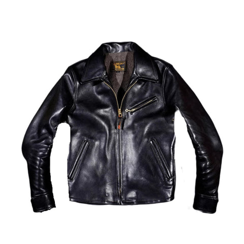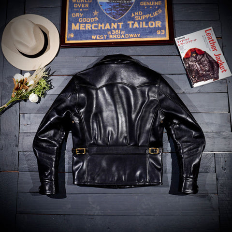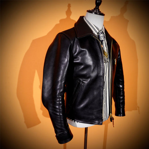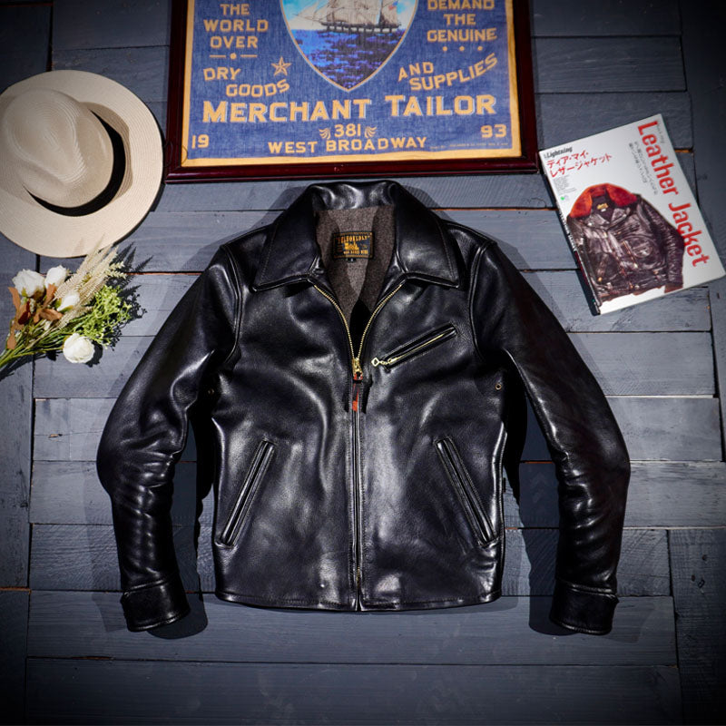 Classic 1930s Moto Style in slim fit. Select from our premium leathers: Japanese Black Tea core horsehide (1.4–1.5mm), rich Japanese Burgundy waxed horsehide (1.4–1.5mm), or American Black cowhide (1.3mm). 1.5mm Vegetable tanned American horsehide (Quilted Lining).