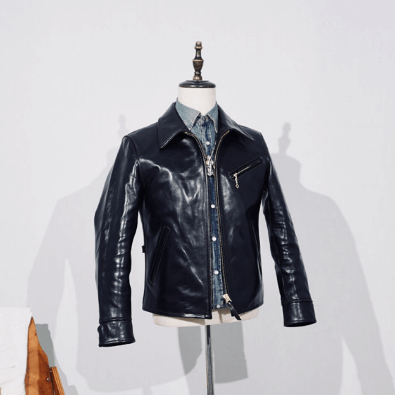 Classic 1930s Moto Style in slim fit. Select from our premium leathers: Japanese Black Tea core horsehide (1.4–1.5mm), rich Japanese Burgundy waxed horsehide (1.4–1.5mm), or American Black cowhide (1.3mm). 1.5mm Vegetable tanned American horsehide (Quilted Lining).
