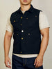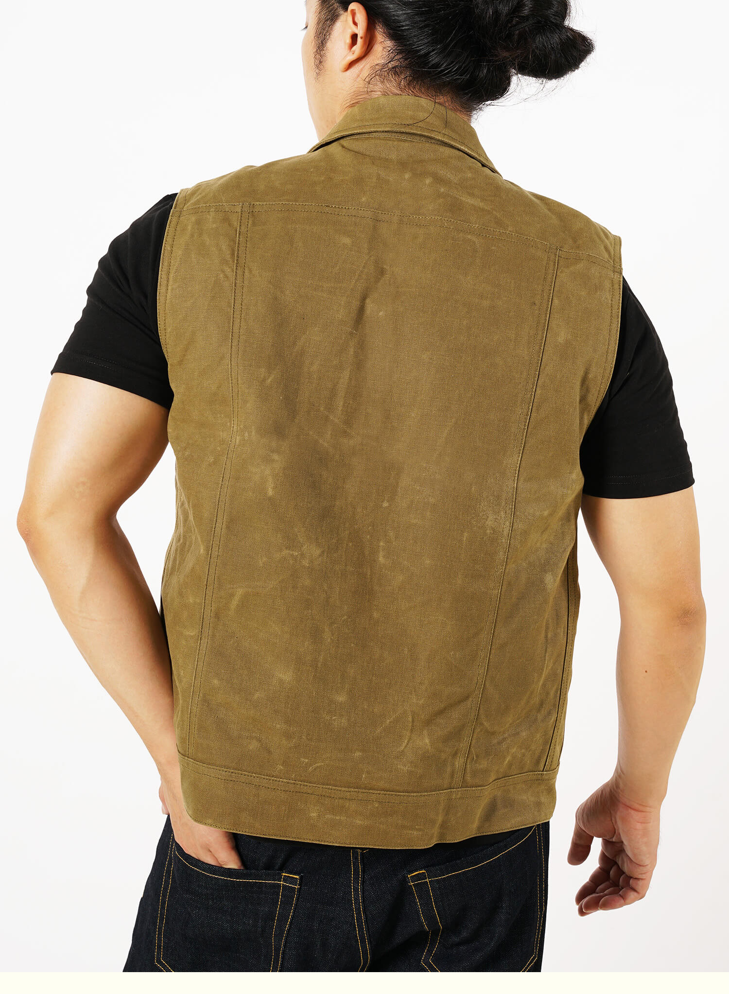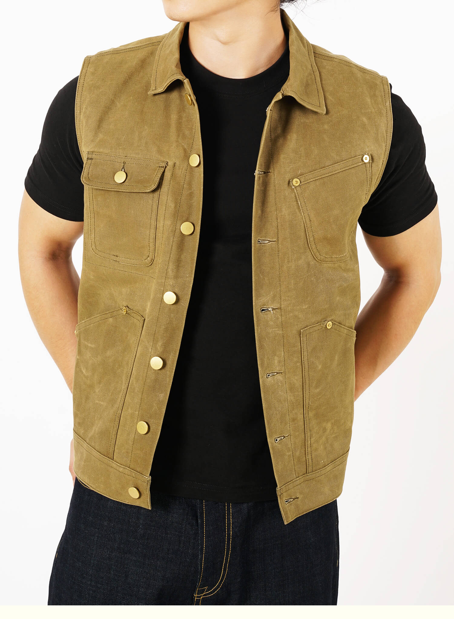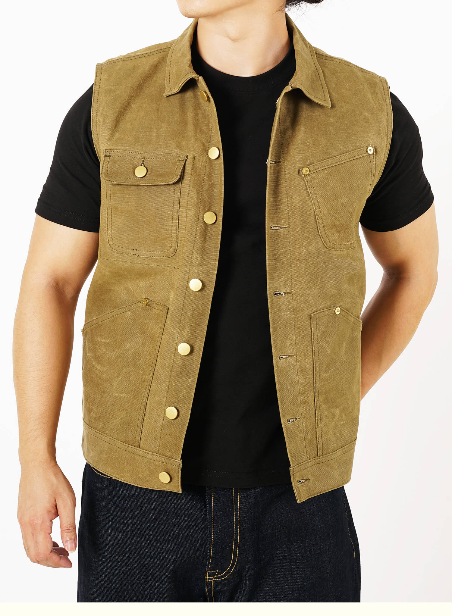 Crafted from rugged 16oz wax canvas, this water-resistant vest offers classic workwear style. Featuring four asymmetric front pockets secured with brass buttons and rivets, it provides ample storage space. The heavy canvas has a waxy coating for water repellency and a vintage look that will only improve over time.