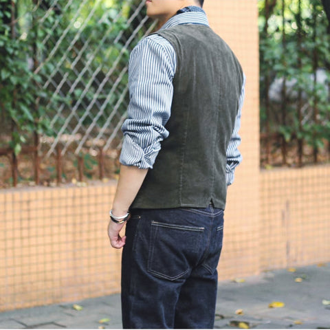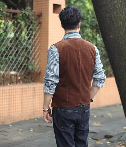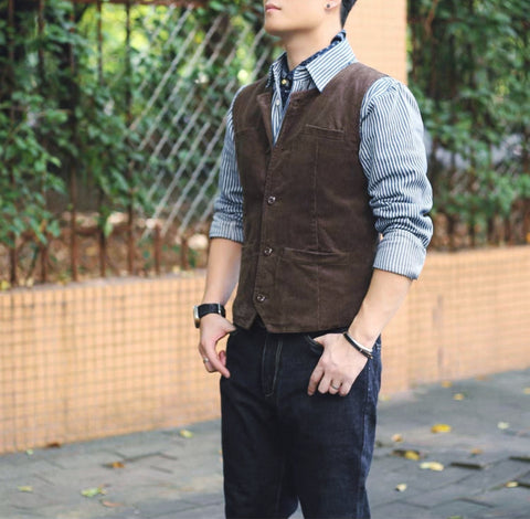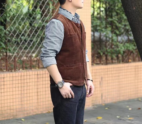 This premium corduroy vest for men features four front pockets for carrying small items and a 5-button closure for an adjustable fit. Made from soft, durable corduroy, it has an O-neckline that flatters the neck and shoulders. With its rich color and texture, this vest layers beautifully over shirts or sweaters. Dress it up or down for a stylish look in any season.