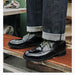 Meticulously crafted from premium polished leather sourced from Italy’s renowned Conceria Polaris, this derby boasts a luxurious glossy finish with a rich, oiled texture. The apron toe design is accentuated by decorative broad arrows on the vamp, adding a distinctive touch of heritage-inspired detailing. Built for durability, it features a robust Goodyear welted construction, ensuring long-lasting wear, while the Vibram ETON rubber sole provides superior traction and comfort.