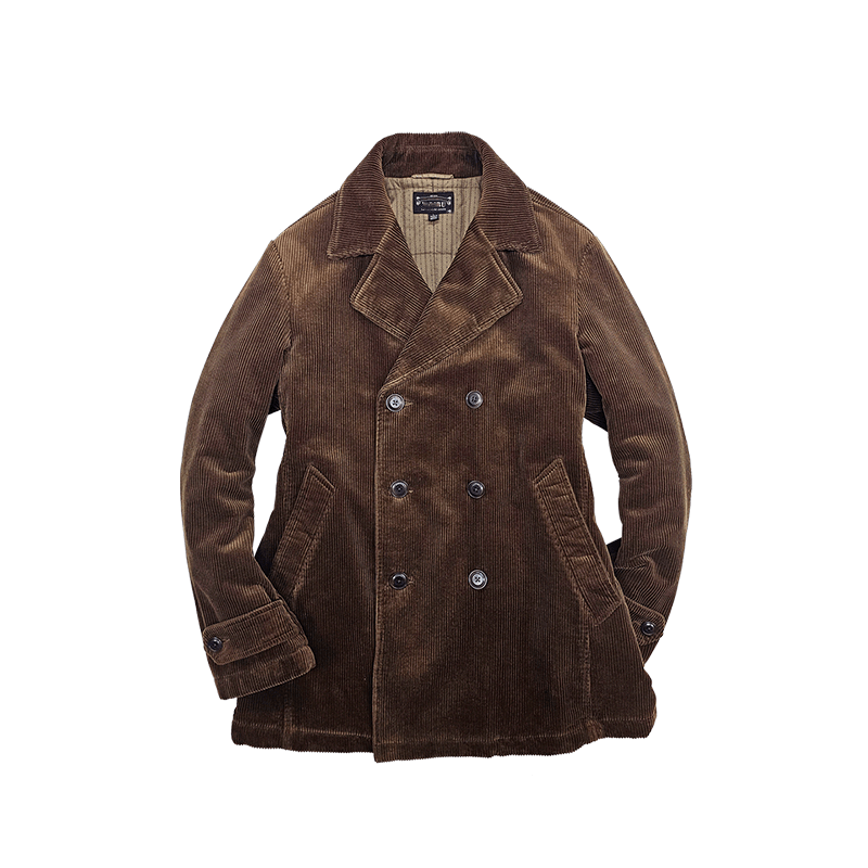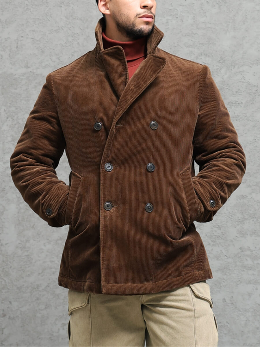 This double-breasted coat, crafted from premium 10.3oz corduroy, combines classic style and modern warmth. Featuring a quilted lining, notch lapels, flap pockets, and a secure fruit buckle closure, it offers both durability and comfort.