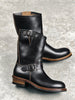 Discover our premium Men's Engineer Boots: 25cm/9.9inches tall with a 4.5cm/1.8inches heel, these motorcycle-style boots blend durability and comfort. Featuring pull-up cowhide uppers, Goodyear construction. The leather insole and natural wood chip filling ensure breathability and custom-fit comfort. Vibram 430 lug sole provide superior traction and stability.