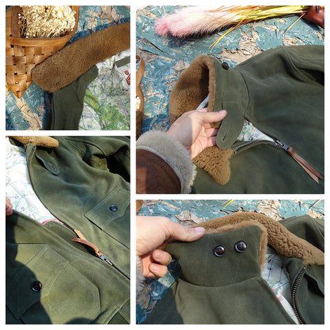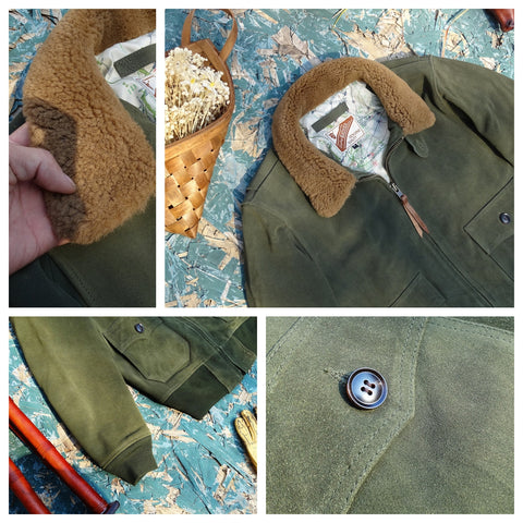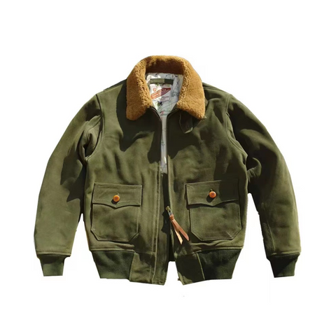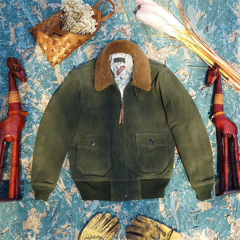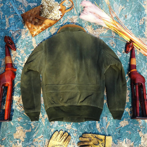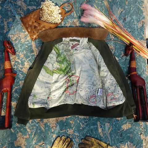 Vintage military style G-1 flight jacket in olive cowhide suede with map printed lining. Features fur collar, front YKK zipper closure, two lower flap pockets with buttons, ribbed cuffs and waistband for a snug fit. Iconic bomber jacket silhouette with classic details like the ribbed knit trim and collar make this a timeless outerwear piece.