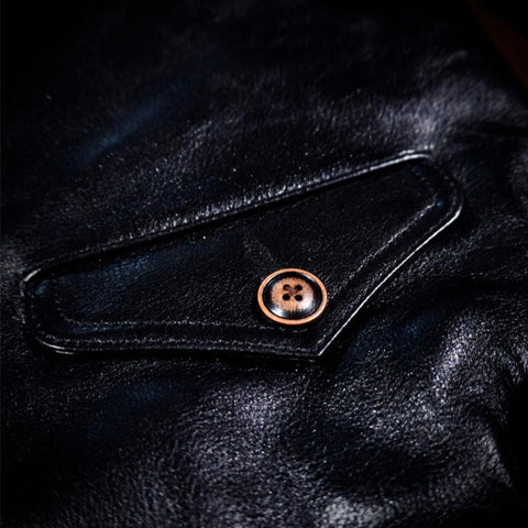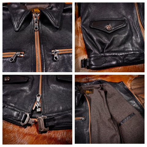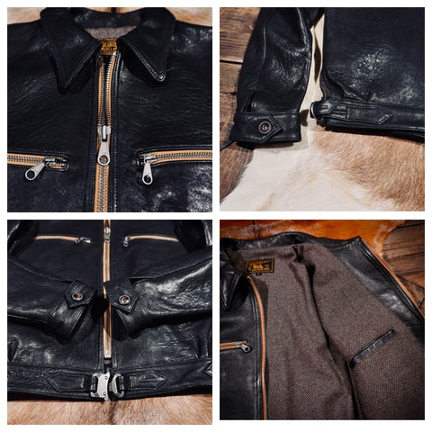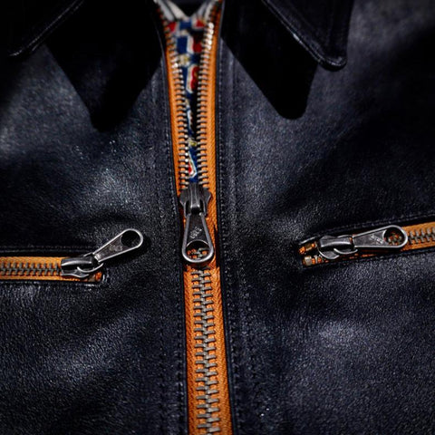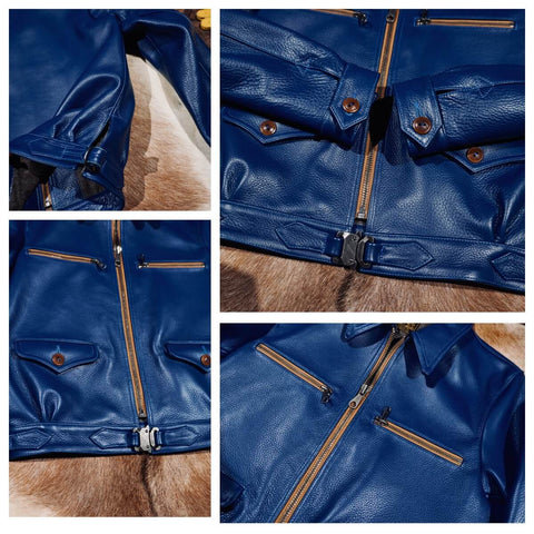Crafted with precision, this jacket offers three premium leather options to suit diverse needs: 1.3mm black Japanese wax horsehide for unparalleled durability, 2mm dark brown/1.6mm blue Italian grain cowhide for toughness, 1.2 mm black French sheepskin for luxurious softness. Each leather type is carefully selected to age beautifully, developing a unique patina that tells your story. The soft cotton lining ensures comfort in any weather.