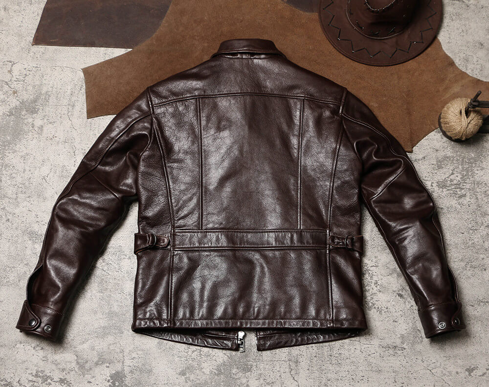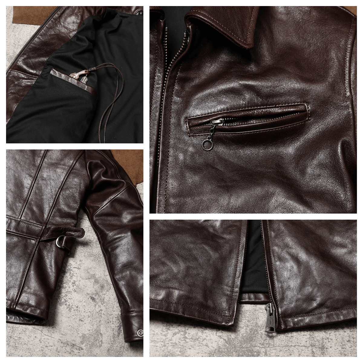 Crafted from soft, durable 0.8mm waxed goatskin leather, this jacket blends timeless style with everyday function. It features a zipped chest pocket, two button-flap bottom pockets, and two side-entry pockets. Available in Black and Dark Brown. Tough, practical, and ready for adventure.