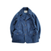 A men's blue sashiko fabric coat with a collar, buttons, and pockets, displayed on a white background.