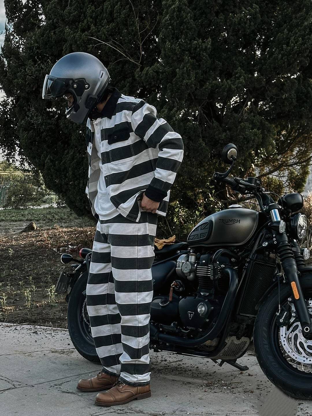 This edgy moto jacket for men is crafted from durable 16oz canvas with a medium-hard hand feel. The classic horizontal striped "prisoner pattern" adds a bold, vintage-inspired look. Button front closure and two buckle pockets provide secure storage.