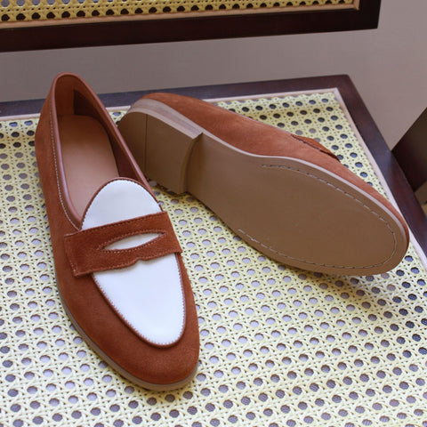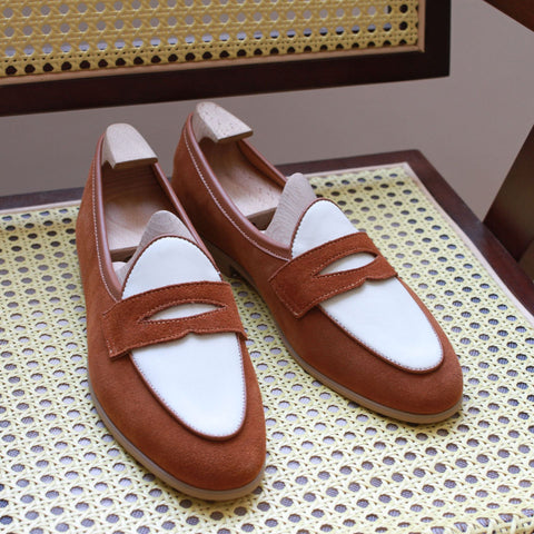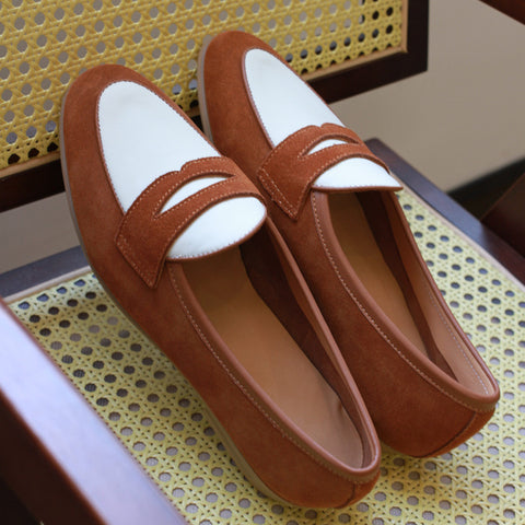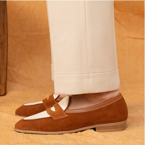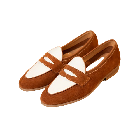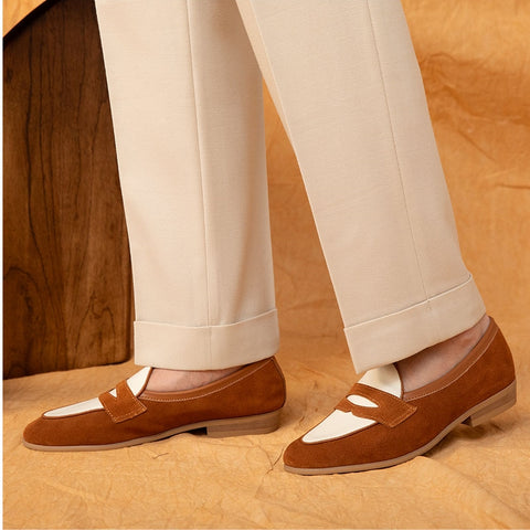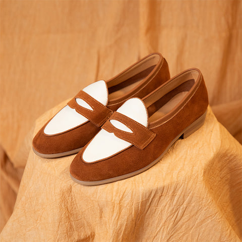 Exude dapper sophistication in our two-tone penny loafers. Premium cowhide uppers blend rich brown and crisp white for an eye-catching colorway. Leather insoles with cushioned footbeds provide all-day comfort. Durable rubber soles offer traction. The classic penny slot adds traditional flair. Dress up any outfit with these versatile loafers. The perfect blend of casual and refined style.