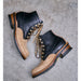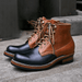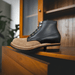 Expertly crafted heritage work boots blending premium leathers in striking patchwork designs. Choose between black local leather with khaki suede, black Horween Chromexcel paired with khaki suede, or a rich caramel Dublin leather combination.
