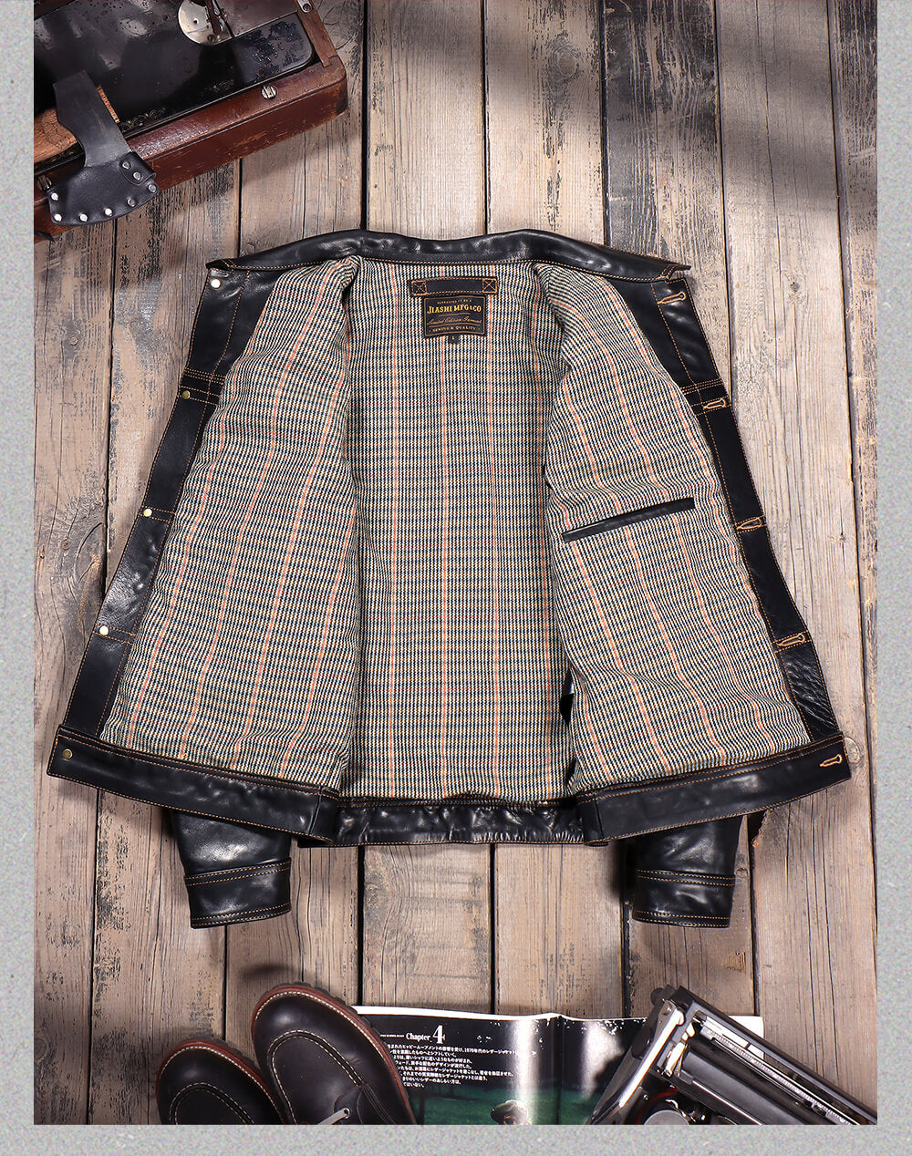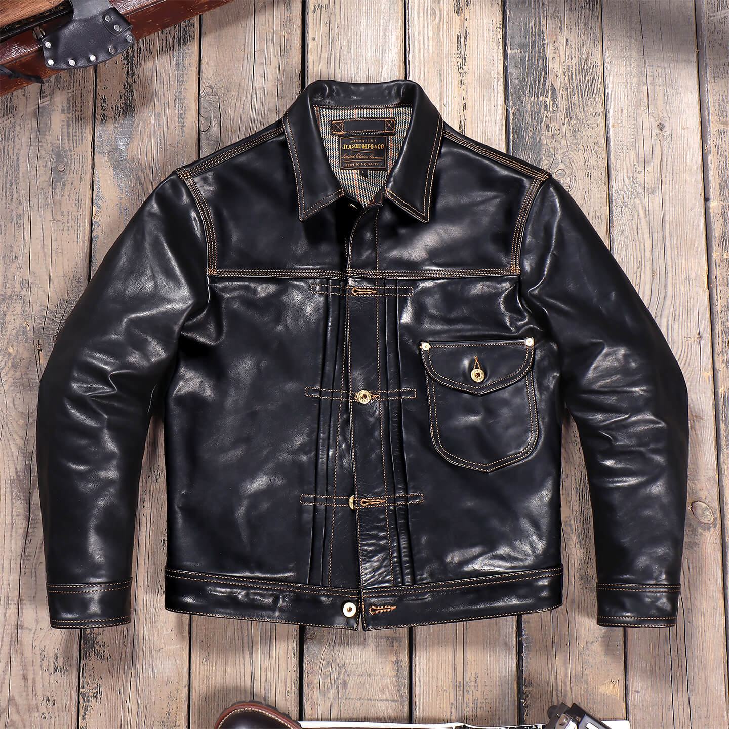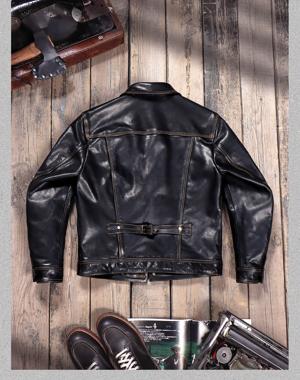 Inspired by the iconic Type I Trucker Denim Jacket, this leather version is crafted from 1.4mm oiled waxed cowhide, offering a rugged yet refined look in a rich brown hue. The cotton-wool blend lining provides warmth, while the brass button closure and single chest pocket stay true to its vintage roots. The adjustable buckleback ensures a customizable fit, blending heritage design with modern comfort.