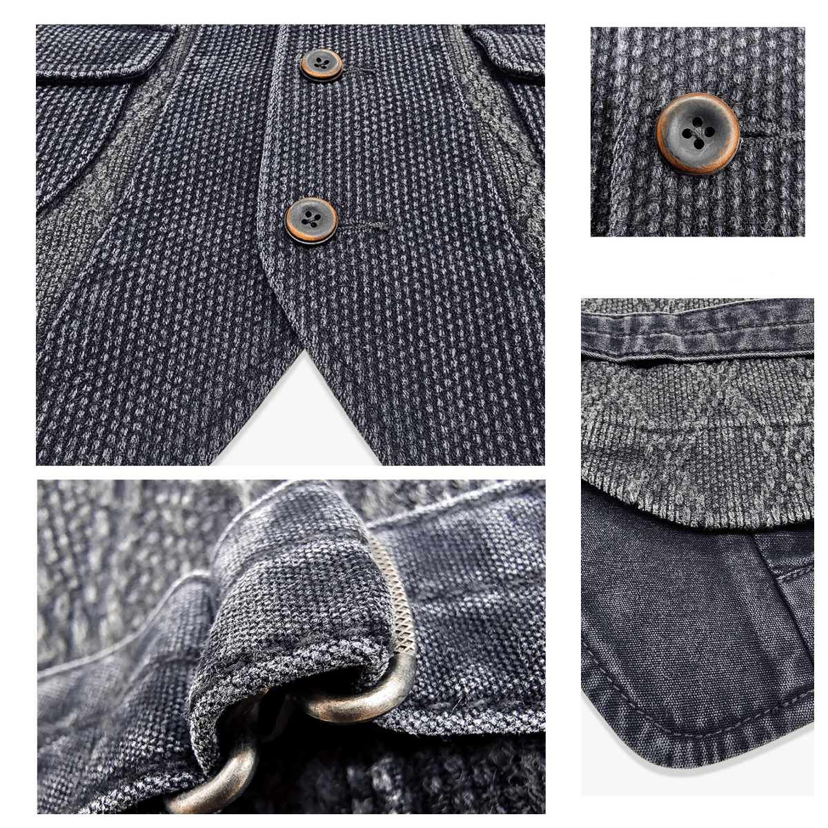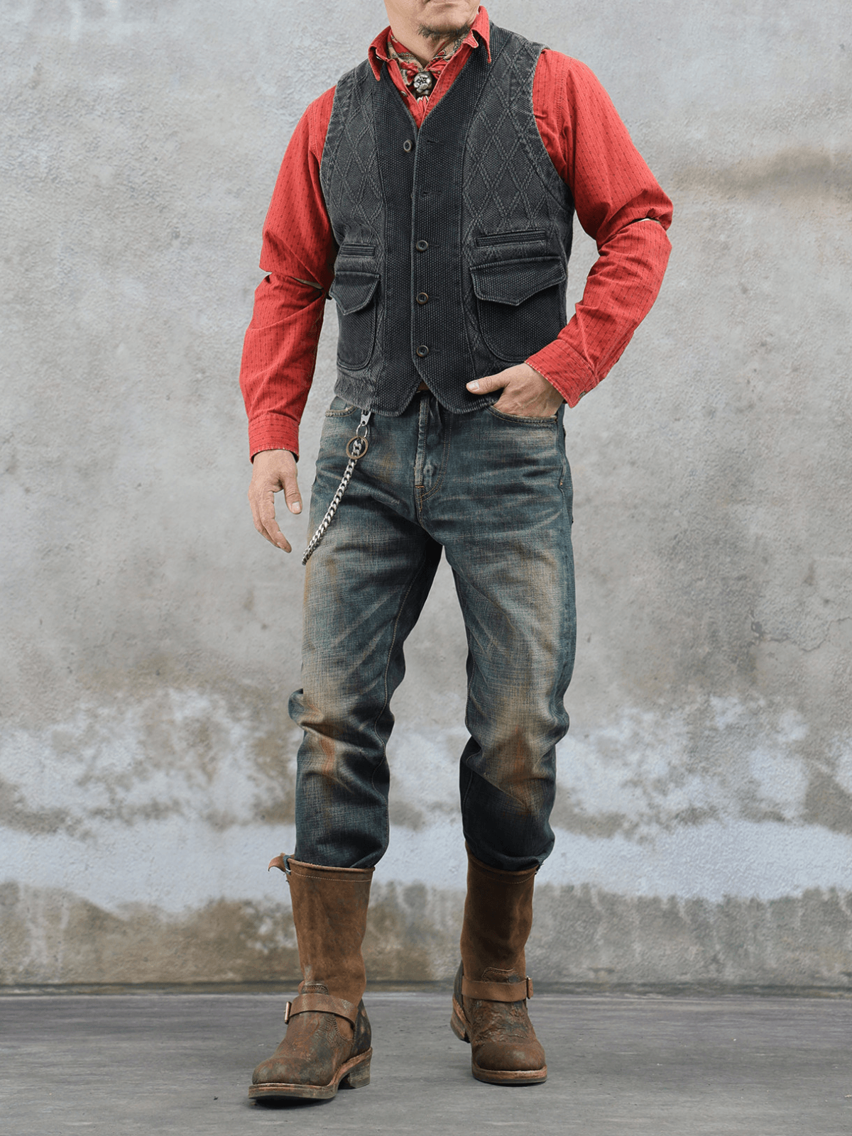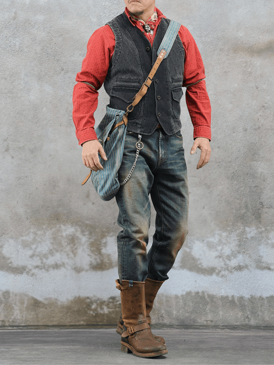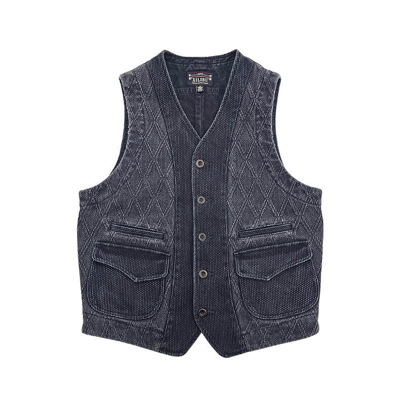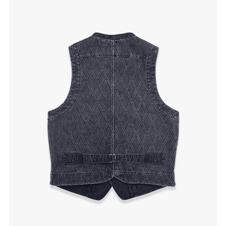 Inspired by classic Japanese kendo wear, this charcoal black vest is built from heavyweight 15oz sashiko cotton with a striking diamond pattern. The fruit button closure, functional lower pockets, and flap pockets deliver authentic Japanese workwear style with rugged durability.