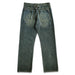 Inspired by vintage workwear, these men's jeans are crafted from durable denim with contrasting vertical stripes reminiscent of classic Longshoreman overalls. Designed with an aged brass buckle, two slanted front pockets, two back patch pockets with buckle closure, and a straight leg cut for a classic silhouette.